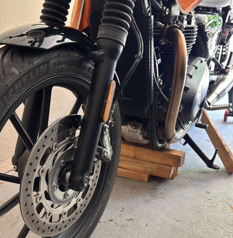 Ze života samodomo troufalýho mechanika... V rámci customizace Triumpha jsem dneska instaloval progresivní pružiny na přední vidli, neboť mají výrazně vylepšit jízdní vlastnosti a především omezit ponořování předku při brzdění. Když nepočítám další upadlej kus železa na nádrž (a další odlomek laku), ačkoli jsem měl v místě froté hadr, moje rozhodnutí měnit pružiny v přední vidli patří mezi méně rozumné. Především z toho důvodu, že bod návodu, abych měl přední kolo vyvěšený ve vzduchu, jsem optimisticky ignoroval s přesvědčením, že pružinu v pohodě stlačím i při stojící motorce, a nadto ještě zašroubuju horní špunt (klíč velikosti 30 + jemnej závit). Fakt, že na mě - poté, co jsem sundal řídítka a odstranil z cesty kabely a hadice - po prvotním uvolnění závitu poměrně dynamicky vyskočily podložky, plastový vložky, to všechno zmáčený od oleje, mě překvapil jen trošku. Po úspěšném vypreparování zbývajících podložek a pružiny a nasoukání nových komponent do vidle jsem čelil cca 8 centimetrům trčící plastové trubky, kterou bylo potřeba zatlačit dovnitř proti pružině a ještě zašroubovat zátku. Tento úkon mi po hodině upoceného snažení, zlomenejch zad, proražený ruky, pokusů nadlehčit kolo, létajících nadávek v kombinaci s horečným proklínáním všeho okolo, dal jasně najevo, že vyvinout soustředěný tlak v jednom směru cca 100 kg a v jeho závěru ještě chytit jemnej závit, bude nad moje síly. Nakonec jsem se uchýlil k tradičnímu řešení. Dal jsem si cigáro a rezignovaně zíral na napůl rozebranej předek motorky. Zkusil jsem si neúspěšně zapůjčit motohever od spřátelené motorkářky, ale zase jsem dostal tip, na jehož základě jsem použil nejjednodušší řešení - zvednutí zadního kola klasickým motozvedákem, podložení středu motorky dřevem a spuštění zadku zase dolů. Pak už všechno trvalo jen cca deset minut. Poučení: Některé body návodu je fajn dodržovat. Padající hliníková zátka vidlice zvládne dopadnout přesně do místa, kde se hadr předchozím úsilím samovolně vychýlil a odkryl nádrž. A samozřejmě zanechat stopu. Pokud existuje riziko, že bude třeba podepřít rám, bylo by fajn těsně předtím neinstalovat ochranný kryt motoru, který ho překrývá. Jedu se projet. Doufám, že na mě cestou někde nevyskáčou pružiny zase ven .