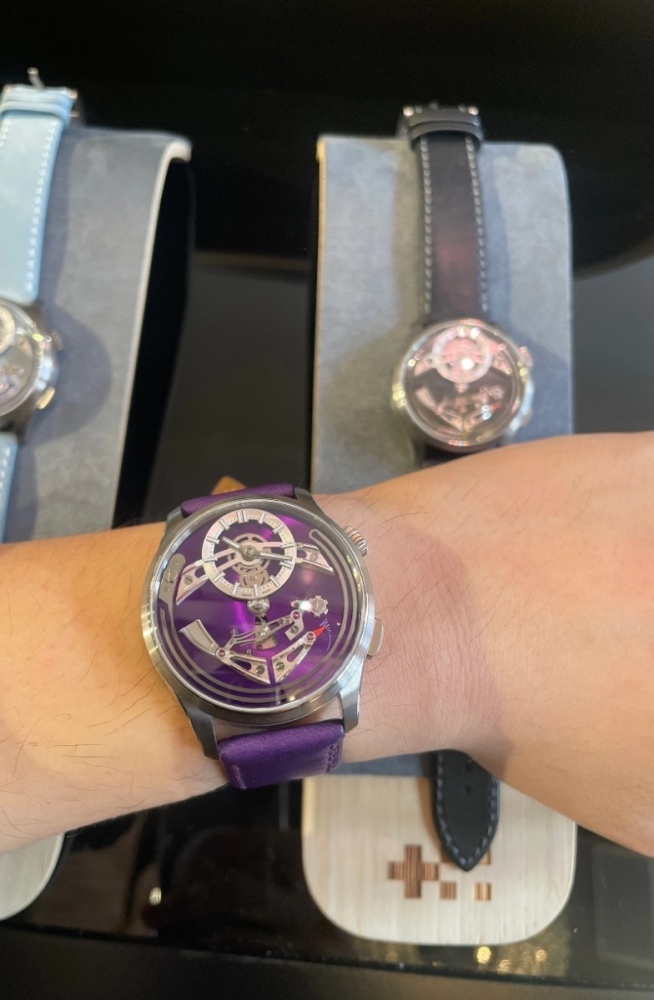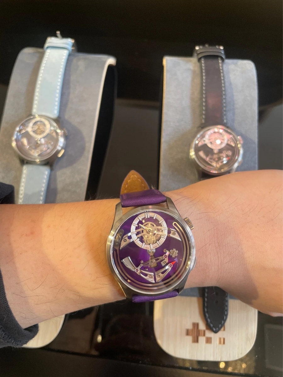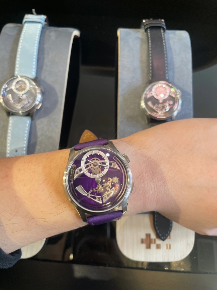 Konečně se mi podařilo objevit C1 Bel Canto Violy focené naživo a dokonce wristshot na fialovém koženém řemenu. Foceno bylo zřejmě v salónu u Wardů. V pozadí jsou světle modré Cielo a černé Nero, oboje na patřičně barevných kožených řemenech. Musím uznat, že jsem vybral fakt dobře a moc se na ně těším. -