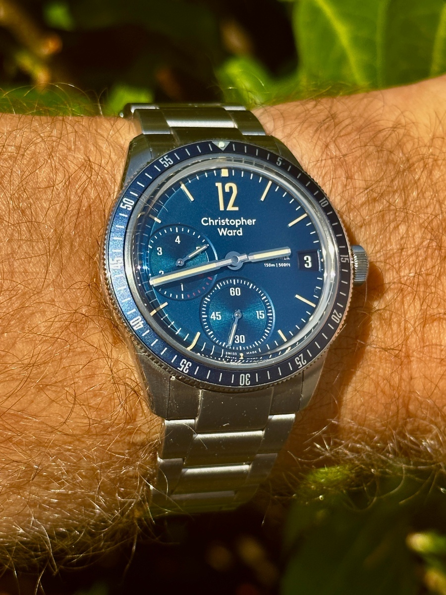 C65 Trident Diver SH21 Limited Edition Šířka pouzdra: 41mm bez korunky Výška pouzdra: 13.4mm Lug2Lug: 47.1mm Šířka nožek: 22mm Voděodolnost: 15ATM = 150m Váha: 77g Kalibr: Automatický IN-HOUSE SH21 COSC Rezerva chodu: 120 hodin = 5 dnů Přesnost: -4/+6 s/den Frekvence: 28.800 polokmitů/hod. = 4 Hz Limitovaná Edice: 150 kusů Uvedení do prodeje: 9.2019 Ukončení prodeje: 2.2021 Podařilo se mi objevit jeden nabízený exemplář této velmi těžce sehnatelné limitky a neodolal jsem. Ciferník První co mě na těchto vintage laděných potápkách zaujalo, byl samozřejmě krásně modře matný ciferník, ladící s modrou lunetou. Změny barvy při hrátkách se světlem jsou díky matu umírněné, od tmavě modré do středně světlých tónů. Aplikované nazlátlé indexy každou 5 minutu ladí barevně s potahem Baton ruček a s velkou 12 na 12 hodině. Design je v podstatě shodný s o rok dříve uvedenými Dokusanovými bronzovými srdcovkami C65 Trident Bronze SH21 LE. Čekal jsem, že ve stříbrno bílém prostředí bude zvolená barva nepatřičná, ale naopak je to velmi zajímavé zpestření a oživení celkového vzhledu hodinek. Všechna nazlátlá barva potom, společně s bodem v trojúhelníku na vrcholu lunety, luminuje pomocí vrstvy Old Radium Super-LumiNova. Ostatní indexy jsou bíle tištěné, včetně subciferníků s výjimkou rezervy nátahu, kde jsou indexy mezi 1 a 0 červené a i 0 samotná, upozorňující tak na blížící se nutnost natažení. Dále mě zaujaly dva vetší subciferníky na 6 a 9 hodině, zasahující a redukující indexy. Došlo i na logo SWISS MADE, které je na dně 6 hodiny bez lupy nečitelné. Subciferníky jsou krásně zpracované v tmavě modrém kruhovém sunburstu, nazývaném Wardy Circular Azzuré. Rezerva nátahu na 9 hodině je jednou z nejužitečnějších komplikací, o to více, pokud je nátah na více dnů. Mimostředná vteřinová ručka na 6 hodině je vždy zajímavým zpestřením, ne-li pak téměř nutností u chronografů. Zajímavým detailem je potom místo křížení subciferníků, kde je vtipně kus toho vteřinového zúžen ladným obloučkem. Důvodem této volby je místo křížení, kde se rezerva nátahu nachází v posledním červeném dni. Na první pohled mi zavadilo logo s velkou 12, ale potom jsem se zadíval pozorně a představil si pomyslnou kružnici kolem této dvojice. Vyšla mi velikost dalšího subciferníku, který doplnil hrozící prázdné místo. Ovšem namísto informace 5 DAYS POWER, kterou již dostatečně zastupuje ukazatel rezervy nátahu na 9 hodině, bych zvolil slovo CHRONOMETER, pro informaci, že se hodinky mohou chlubit certifikovaným kalibrem. Rovněž uvedení voděodolnosti je zdvojená informace, kterou je možné najít na dýnku. Oba texty zde ale plní i funkci přechodového můstku k datumovému okénku, které, shodně se subciferníky, zasahuje až na hranu ciferníku. Datumové okénko má zajímavě netradiční tvar lichoběžníku, pro lepší čitelnost je kotouč černý s bílými arabskými číslicemi. Vzhledem k velikosti kalibru SH21 a umístění jeho datumového kotouče, společně ještě s velikostí lunety, je 41mm na hranici proveditelnosti a proto ta těsnost u okraje ciferníku. Luneta Uni hliníková luneta jde potápkově 120 kliků proti směru hodinových ruček, a to ztuha a silně cvaká, což je ideální. Doplňuje přesně vzhled hodinek, jak indexy, tak i barevnou kombinací. Její malá šířka je velmi dobře zvolena jak k přechodu do vypouklého safíru, tak vintage vzhledu. Korunka Korunka má ideální velikost na pohodlné ovládání, jen není šroubovací. To bych u potápek sice čekal, nicméně díky vintage ladění celých hodinek byla zachována i nešroubovací varianta. Pouzdro Lightcatcher pouzdro s leštěnými hranami má zaoblené nožky a tím pádem sedí perfektně na ruce. Výška by se někomu mohla zdát už moc, ale v reálu tomu tak vůbec není. Klidně bych si je vzal i pod košili. Plné dýnko je rovněž precizně zpracované už samotný vystupující velký trojzubec odkazuje na rodinu Tridentů, když byla tato výsada odepřena vteřinové ručce. Škoda, že není průhled na strojovnu, dvoubarelová SH21 mechanika by si to jistě zasloužila. Tím se dostáváme ke skryté perle těchto hodinek. Zajímavostí je u dvoubarelového nátahu je vyšší frekvence chodu 28.800 polokmitů/hod, která bývá nižší. 120 hodin rezervy s certifikovanou přesností chodu není třeba nějak dlouze komentovat. Voděodolnost 150m není málo. Se šroubovací korunkou se mohlo dosáhnout hlouběji, ale bylo by po vintage feelu. Nicméně vzhledem k povaze hodinek, které svádějí k totální univerzálnosti, nemám výhrad. Jen je třeba na to pamatovat a nepadat do vody s vytaženou korunkou. Kromě výše řečeného oplývají hodinky jedním prvenstvím. Jde o první uvedení automatického IN-HOUSE kalibru SH21 v kombinaci se subciferníky s ukazatelem nátahu a small second. Neubráním se srovnání s C65 Trident Bronze SH21 LE, i když jsem je zatím neměl tu čest vidět osobně. Rozdílů není mnoho, pro někoho ale mohou být velmi podstatné. Jako první vždy uvedu zde popisované hodinky. Materiál pouzdra - Ocel vs Bronz - tak to je podle osobních preferencí. Mě by nevadil ani bronz, lépe ladí k barvě aplikovaných indexů a může časem více doslova "chemicky splynout" s majitelem. Dle mého soudu se stříbrná dá daleko lépe kombinovat s různými barvami řemínků, tedy pokud zůstaneme v rovině estetiky. Strojek SH21 - Automat vs Manuál - Asi mám raději automaty, šup s nimi doma do natahovače a je to. Nicméně manuální nátah je více osobní záležitost s jasně rozpoznatelným bodem plného nátahu. U manuálu dochází k menšímu opotřebení při nošení i mimo natahovač. Výhoda manuálu je i ve výšce pouzdra, kte