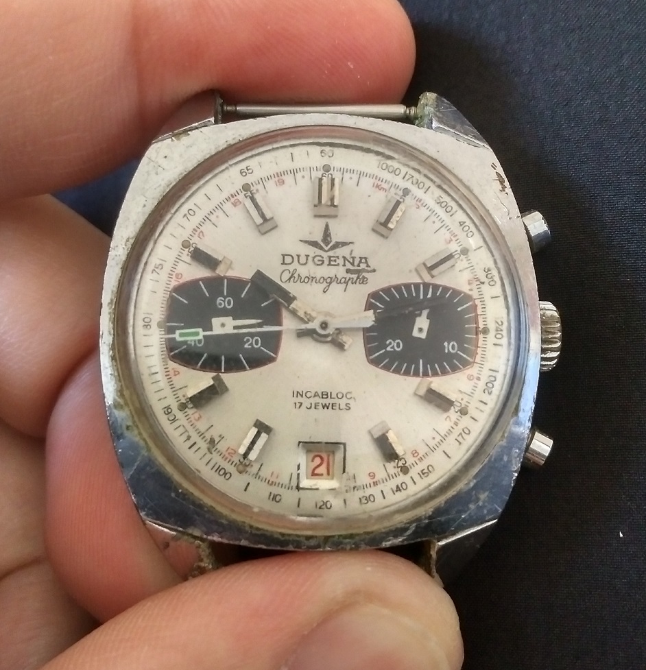 Velká pravda a mnohokrát děkuji za první odpověď obdrženou na fóru. Dodalo mi to odvahy a proto si na Vás dovolím vybalit další kus, nad kterým budete nevěřícně kroutit hlavou. Další srdcovka, moje staré Dugena Chronografy, 520549, které jsem našel polorezavé u svého táty, koupil pro ně na ebay oranžovou sekundovou ručičku (se clem i DPH mě přišla jen na 1 200 Kč , která tam patří, a poslal panu Uhrovi do Prostějova, jestli by s nimi něco neudělal. Napsal mi hroznou diagnózu, hodinky v šíleném stavu, ale pokusí se něco udělat. Tak čekám a přeji mu pevnou ruku: zalomený šroub a nejde to odvrtat (ocel v mosazi). Jsou to ale hodinky, které se mnou přežily před 30 lety pád na kole, kdy mi nějaké dobračisko povolilo "motýlky" na předním kole a já skončil na 3 týdny v nemocnici. Hodinky jsem tehdy řádně zrychtoval a známky pádu jsou stále vidět: pokroucené ručky, sekundovka původní úplně odletěla a byla nahrazena tím, co tenkrát bylo. Byl na nich tehdy kovový tah, takový náramek s olympijskými kruhy, ale ten jsem už nenašel. Posílám fotky svých a jednu fotku z internetu (ty mají tu oranžovou ručičku). Držím palce panu hodináři a tím i sobě.