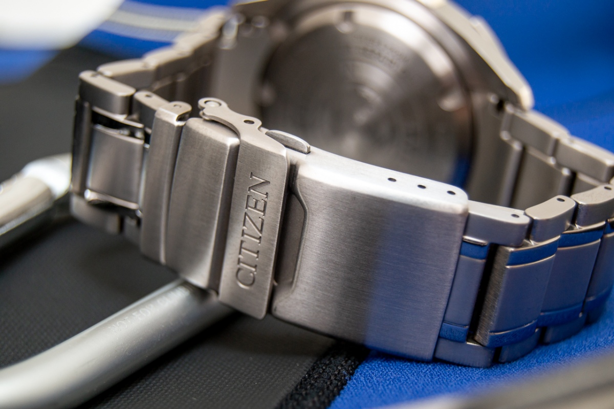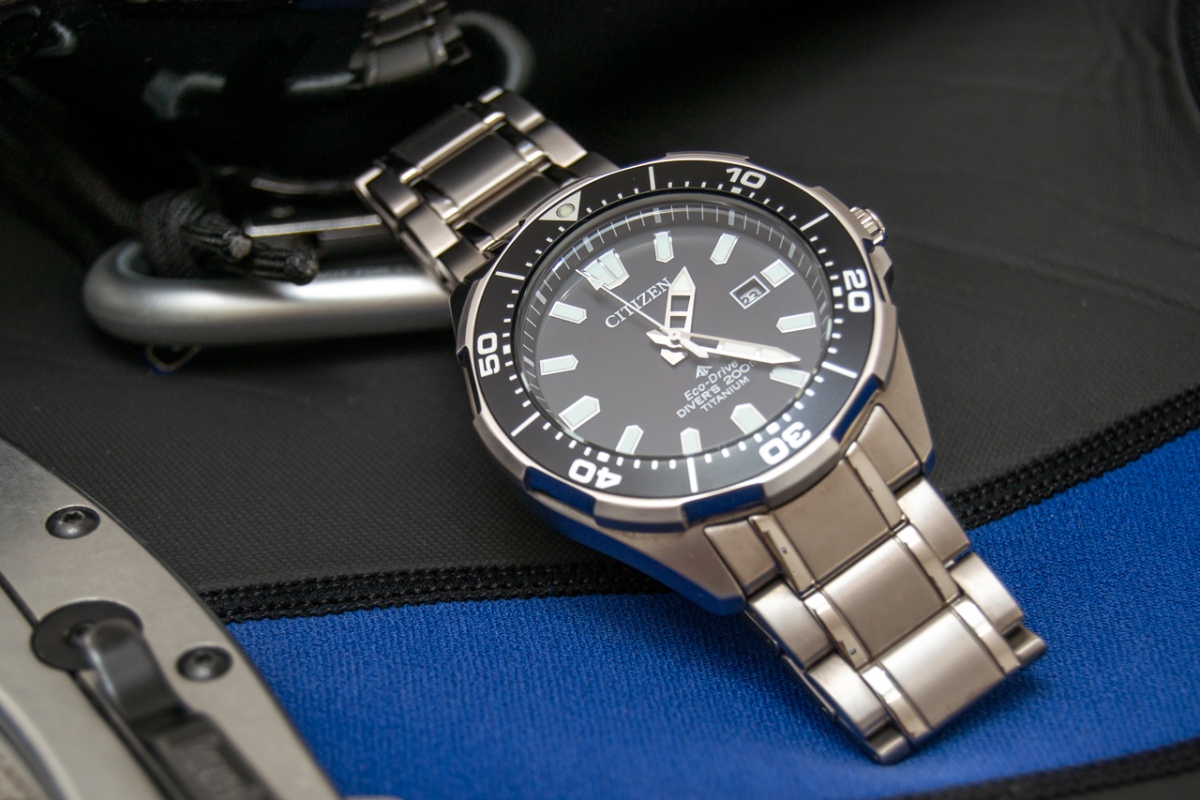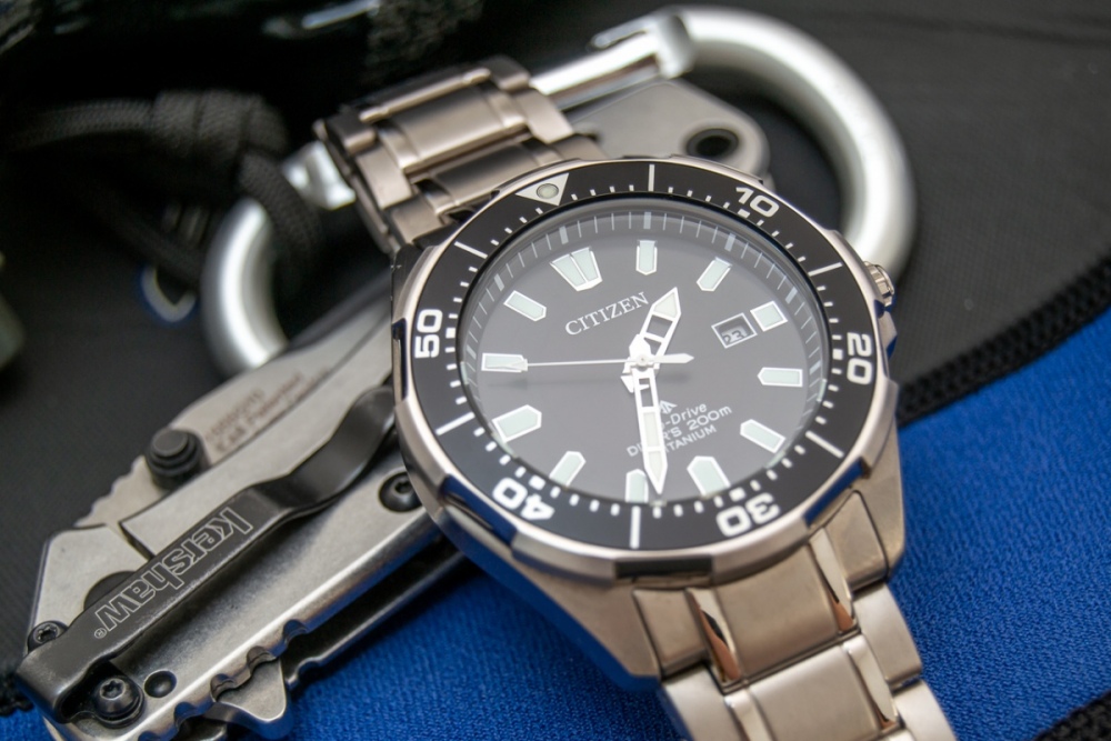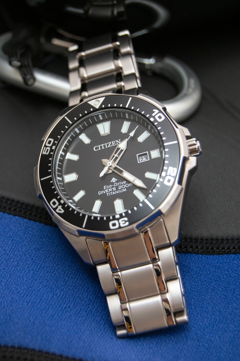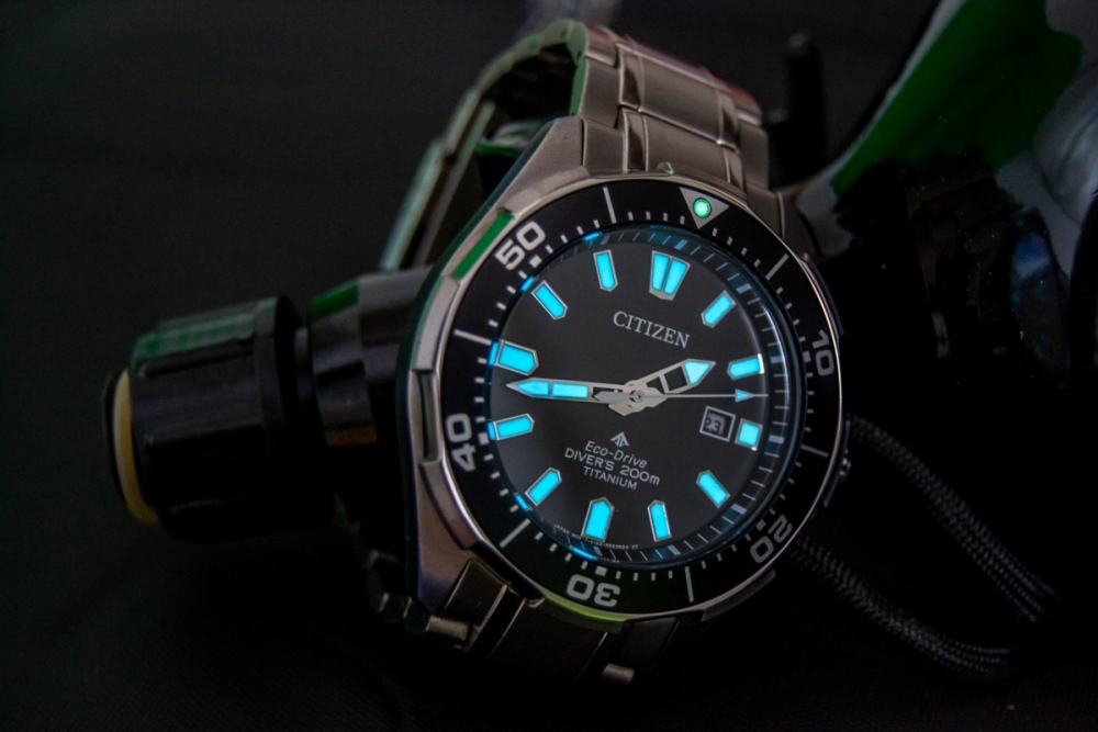 Pár postřehů po necelém roce vlastnictví a občasného nošení, než půjdou do světa... Celkově vzato jsou to v poměru výbava/cena jen těžko překonatelné potápky, pokud člověk netrvá na mechanickém strojku. Vybíral jsem je hlavně kvůli celotitanové konstrukci včetně tahu s plnými endlinky a frézovanou signovanou sponou, což se opravdu odrazilo na pohodlí nošení – zmenšené na moje 18,5 cm zápěstí váží 102 g, na ruce jsou krásně vyvážené a opravdu lehké, jedním slovem paráda. Titan by měl být podle Citizenu potažený jakousi tvrdou vrstvou (Super Titanium), a pokud mohu soudit, tak to opravdu funguje – samotné pouzdro hodinek mám zatím bez šrámu, na sponě je jediná větší vlásečnice, a i když tah má vlásečnic víc, drží se taky velmi statečně. S čím si ale u titanu nerozumím, je barva – prostě jsem si na ten lehce šedohnědý nádech v porovnání s ocelí nezvykl. Další věc (a to nevím, jestli je titanem obecně nebo tím povlakem) je náchylnost na šmouhy a otisky prstů – vidíte určitě na fotkách, i když jsem se snažil leštit a leštit... Zmíněmý tah je široký 22 mm u pacek (= lug distanc), ke sponě se zužuje na 20, ale na ruce působí jako rovný, 1 mm zúžení na každé straně není skoro vidět. Nastavování tahu je klasický "pin and collar", tedy osičky s válečkovými zarážkami. Průměr pouzdra bez korunky je podle mé šuplery 43,5 mm, díky členité lunetě působí hodinky opticky menším dojmem. Lug-to-lug je chloupek pod 50 mm. Pro někoho bude možná trochu disproporční malá (signovaná) a samozřejmě šroubovací korunka. Mně víc než její malá velikost vadí její hodně volný chod při seřizování hodinek, mám radši mechanicky pevnější pocit, ale to je samozřejmě jen osobní preference. Naštěstí se nemusí seřizovat moc často (k tomu se dostanu...) Luneta má 60 kliků, má celkem volnější chod (občes se mi během nošení pohne), ale zato je na mém kousku krásně zarovnaná, běží přesně po indexech. Ne úplně běžné je pojetí úchopových zubů na okraji lunety, je jich jen 8 hodně širokých a v mezerách mezi nimi je okraj leštěný. Je to spíš věc designu než funkce, díky lehkému chodu lunety není potřeba na otáčení moc gripu. Vložka v lunetě je lakovaný hliník se zelenou luminiscenční pipkou. No a přes luminiscenci se dostáváme k ciferníku. Na něm je luminicsence modravá, a co můžu srovnat, tak moc pěkná. Ve srovnání se Seiko SKX013 a 009 nemá takový počáteční jas, ale v řádu desítek sekund se jas srovná a Citizeny mají v realisticky delších časech po nasvícení čitelnost lepší – což může být i barvou lumi a tvarem/velikostí indexů, ale podle mě lumi celkově vzato na, nebo i lehce nad úrovní SKX. Indexy jsou aplikované s krásně lesklými okraji, nicméně poměrně placaté, takže nějakou extra hloubku ciferníku nedodávají, ale i tak jsou ku prospěchu, protože ty jejich lesklé rámečky v jistých úhlech odrážejí celkem dost světla a tak zlepšují čitelnost. A to je bohužel potřeba díky asi největší slabině – minerálnímu krystalu bez AR... No jo, život je otázkou kompromisů, ale minerál u mně zatím odolává bez poskvrnky. Ciferník samotný je saténově matný (na netu putuje pár fotek, kde má sunburst, ale to je odbarvená fotka modré verze, černá sunburst nemá). Ručky jsou podle mě jedním z nejvydařenějších detailů hodinek, krom toho, že se mi tvarově prostě líbí, jsou hodinová a minutová ručička příčně prolomené, což v kombinaci s lesklým povrchem hází zajímavé odlesky, a řekl bych, že to je opět plus pro čitelnost. Sekundovka je bílá. Stran provedení trochu pokulhává zarovnání chapter ringu, čili není to problém jen Seika – podle fotek tak různě na netu je to i u těchle Citizenů běžný jev. Což je nutno říci celkem škoda, protože jinak jde sekundová ručka po indexech naprosto vzorně (u těch mých se to s chapter ringem rozjede mezi druhou a osmou hodinou, na dvanáctnte lícuje všechno krásně, a kdyby byl chapter ring rovně, bylo by vše parádní). No a jako poslední bod strojek. Do ecodrivu jsem šel s tím, že je budu mít jako referenční čas v hodinkovnici a to se celkem povedlo, přesnost mě příjemně překvapila – za 100 dnů udělaly +6,3 s, což jsou necelé 2 s za měsíc do plusu, což mi přijde fajn. No a proč půjdou do světa? Jednoduše řečeno – emoce. Po ryze technické stránce jsou to moje nejlepší hodinky – přesné, bezúdržbové, celotitan na tahu, pohodlné, čitelné, ale s pořízením SKX009 a s přítomností pár dalších "obstarožních vehiklů" v hodinkovnici jsem si uvědomil, že když mám Citizeny na ruce, tak se vlastně těším, až je vyměním za nějaký ten technicky zastaralý křáp, protože s tím křápem si tak nějak víc rozumím. A samozřejmě i současná retro estetika, které neminula snad nikoho, není modernímu designu těchhle citizenů, které mi, bůhví proč, připomínají letoun F-117, nakloněna. Tolik tedy k mým nejlepším, ale zároveň nejméně oblíbeným hodinkám