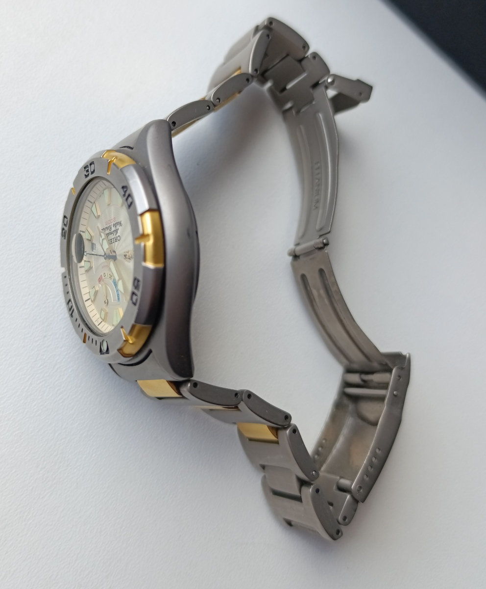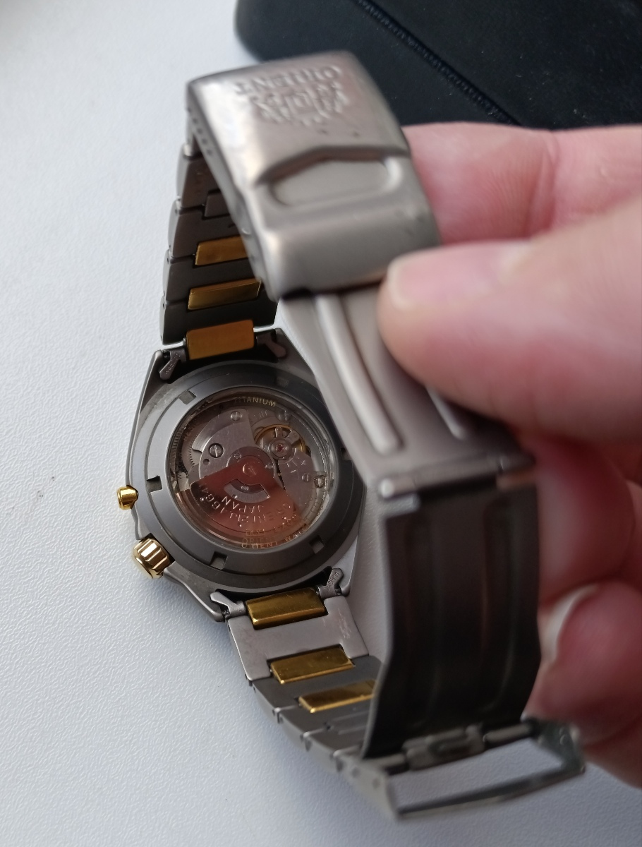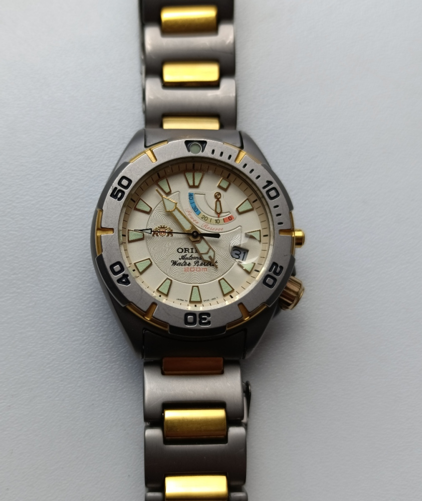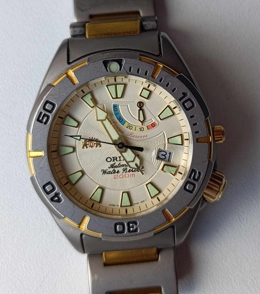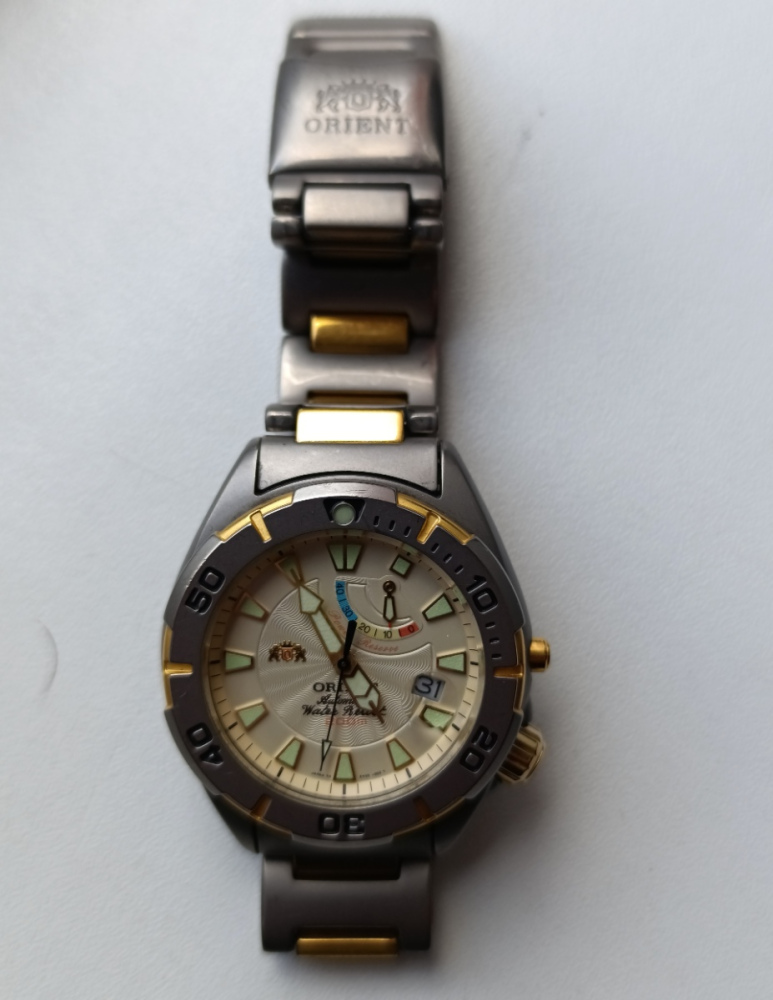 Prodám nesehnatelné, skvěle zachovalé, automatické hodinky Orient M-Force první generace v bicoloru a titanu, na ruku max 18cm včetně dobové koženkové krabičky, jdou lehce do mínusu, servis jsem neřešil, průměr 41mm bez korunky, WR 200m, ukazatel rezervy nátahu, potřebuju šrouby na jiný kus historie, pokud se vyhlídnutý kousek prodá akce končí, chci za ně 5500,- a Upování neplánuji, spíš si to rychle rozmyslím, osobně Karlovarsko nebo zásilkovnou, děkuji za pozornost a Chronomagu za prostor