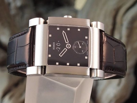 U Piccadilly rade je zachované pohyblivé napojenie nožičiek k puzdru, v decentnejšom prevedení. Z Avenue preberá aj skeletové ručičky. Táto rada, podobne ako u predošlých, začína veľmi čistým prevedením, pri ďalších modeloch sa "nabaľujú" funkcie. Piccadilly Small Date Piccadilly GMT Piccadilly Day by Day (Triple Calendar) Piccadilly Chronograph s Valjoux 7750 Piccadilly Chronograph Reserve Piccadilly Hours je zvláštny model, nie je úplne jednoznačným chronografom, určite nie na prvý pohľad s klasickým rozmiestnením chrono subciferníkov. Len samotný hodinový, resp. polhodinový subciferník skutočne nie je bežným prevedením chronografu. ------------------------------------------------------------------------------------------------------------------------------------------------------------------------- Zo športovejších spomeniem mohutný 47mm model X-Tide v automate alebo quartz. Vzhľadom môžu evokovať aj potápky, ale nie je to tak. Ciferník je v sendvičovom vrstvení. Luneta s výrazným lumi bodom je však pevná, nedá sa ňou točiť. Ochrana korunky je ešte zvýšená dodatočným puzdrom - klietkou, ktorá má zvýšiť aj ochranu hriadelky korunky. Samotná vodotesná korunka s dvojitým tesnením, nie je šrúbovacia, je v push up/down režime. Červená farba má napomôcť vizuálnej kontrole o jej správnej "docvaknutej" pozícii. --------------------------------------------------------------------------------------------------------------------------------------------------------------------------- Portfólio Xemexu ešte tvorí substílnejšia rada Arte výlučne venovaná dámam. Modely len v quartz verzii: a mohutnejšia rada Concept pre pánov, rovnako len v quartz. Pre ukážku big date a chronograf: -------------------------------------------------------------------------------------------------------------------------------------------------------------------------------- Na záver som si nechal niečo špeciálne, niečo, čo som už naznačil u rady Offroad a funkcie pohyblivých nožičiek. Koľkokrát si človek pri pohľade na krásne dýnko povedal, žeby ich nosil aj obrátene. A práve u rady DualSided to Külling vymyslel presne tak, aby bolo možné využiť obe strany, čo mu práve tie pohyblivé nožičky umožňovali. Upravil tvar spony, aby sa dala zapnúť v oboch polohách. Sám autor DualSided nazýva "Fat boy" a to sedí, puzdro pribralo do výšky takmer 2cm. Traveler DualSided ponúka nastavenie času v dvoch časových pásmach, a zároveň, ak si nastavíte rovnaký čas, tak rieši dilému, akú farbu hodiniek si vziať. Čierny alebo biely ciferník? Máte tak všetko v jednom. Alebo chcete kombináciu čistého vizuálu ciferníka, ktorý nenarúša žiaden subciferník chronografu, ale napriek tomu tam chronograf je? Nech sa páči, quartzový Chronus DualSided s 30min chronografom: Tieto zaujímavé modely však už v aktuálnej kolekcii nenájdeme. ------------------------------------------------------------------------------------------------------------------------------------------------------------------------ Hodinky Xemex sú veľmi charakteristické. Nevidíme ich na každom kroku, ale práve to im dáva punc nezameniteľnosti. Dôkazom toho je to, že hodinky Xemex od Ruediho Küllinga nájdeme v zbierkach svetoznámych múzeí dizajnu v Londýne, New Yorku a Chicagu. V nich nájdeme aj jeho práce ako reklamného grafika ešte z predošlého povolania. Ano, takto funguje prepojenie návrhárskych odvetví. Rád by som poďakoval Hansovi Gruberovi z Xemexu za odpovede na moje dotazy ohľadom niektorých modelov, ku ktorým sa doplňujúce informácie hľadali ťažko. ------------------------------------------------------------------------------------------------------------------------------------------------------------------------ zdroje: watch-wiki.net, watches-lexic.ch/xemex, uhren-wiki.com, xemex.com, carousell.com.hk, jckonline.com, zapatajoyeros.com, watch-colle.com, invaluable.com, uhrforum.de/kapitan, uhrforum.de/mercedes, ebay.com/karapet31, ebay.com/kampfer-uhren, mywatchmart.com, vintagewatchstudio.com, ablogtowatch.com, mx.grissoms.com, contemporis.com, watchonista.com, swisstimehq.com.au, watchspace.co.uk, Náramkové hodinky od r.1925 dodnes - Slovart, thewatchpreserve.com
