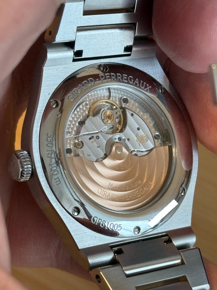 Pokukoval jsem po nich už pár let. Když jsem je ve Švýcarsku našel v téměř 100% stavu za super peníz, neodolal jsem. Mám užší zápěstí, takže těch 38mm sedí skvěle. Info: https://www.girard-perregaux.com/row_en/81005-11-3460-1cm.html