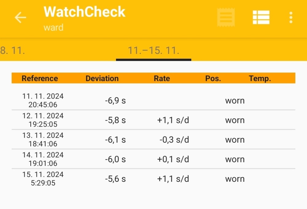 Dovolím si vložit takový "chlubící" příspěvek Před pár lety jsem tu koupil staré C63 se Sellitou. Nosil jsem je velice zřídka a zhruba před měsícem mě popadla touha mít svoje hodinky co nejpřesnější, tak jsem začal postupně tahat z hodinkovnice a od nejlevnějších ladil. Podařilo se mi asi pět hodinek (vesměs Seiko) vyladit na +-2s denně a minulý týden přišly na řady tyto Wardy a k mému překvapení dost nevalný počáteční výsledek -10s denně. Přes týden je nosím nonstop i v noci (hodinky nesundávám) a ladění proběhlo postupně na třikrát. Výstup po poslední korekci níže. Myslím, že ten poslední pohyb šroubováku byl zlatý