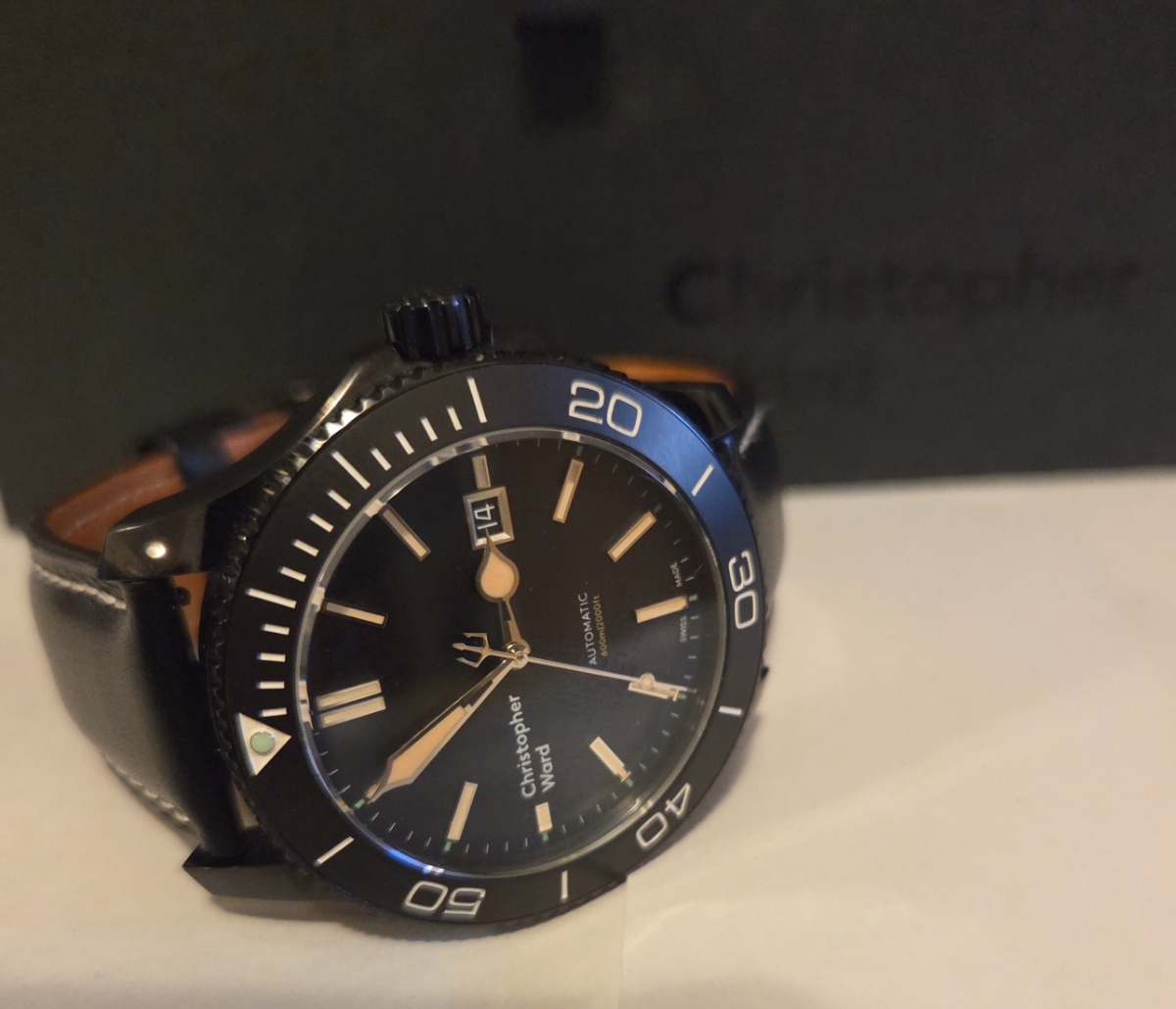 Za svého svagra (hodinky mám u sebe) opět nabízím k prodeji parádní Christopher Ward C60 Trident Pro 600 Vintage. Jde o první CW C60 model dostupný ve „vintage“ stylu, kde ručičky i hodinové indexy dostaly krémovou luminiscenci (místo obvyklé bílé). Tento kousek vychází z původních Mk2 C60 Vintage, ale v roce 2017 je společnost CW aktualizovala o nové logo na deváté hodině. Tento konkrétní model je již celkem obtížné sehnat. Hodinky jsou ve velmi dobrém stavu a na PVD povrchu jsem nenašel žádnou, okem viditelnou, vadu. Sklo je také čisté a známky nošení jsou znát především na dýnku a tahu. Hodinky mají kompletní balení i s doklady a opravdu VELKOU krabicí. K originálnímu tahu přidám několik kvalitních řemenů. Některé z nich jsou také origo CW s logem. Specifikace: Velikost pouzdra: 43 mm Šířka řemínku: 22 mm Výška: 13,3 mm Vodotěsnost: 600 m Sklo: safírové s antireflexní vrstvou Strojek: Sellita SW200-1 Cena 14.500,- Kč včetně dopravy na balikovnu. Teoreticky možná i nějaka výměna, ale ta by musela být opravdu zajímavá. Prodej má každopádně přednost.
