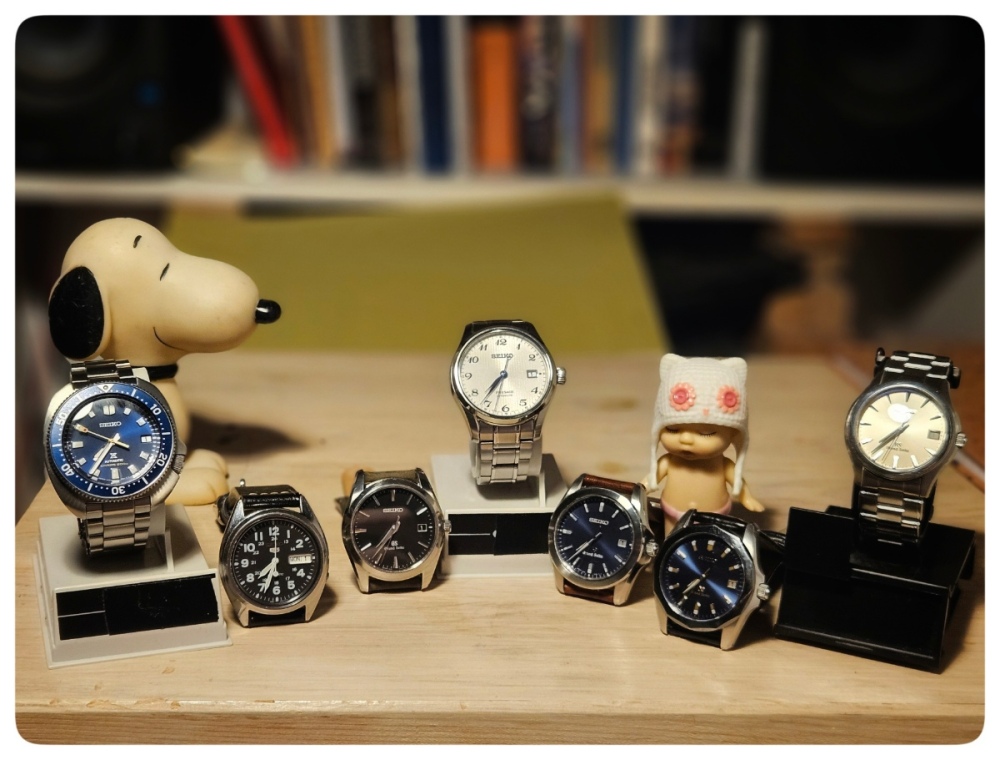jj, chápu... já mám doma štvery relativně malý GS, takže mi vyhovuje, že tyhle jsou větší, jinak bych měl další malé seika. a na druhou stranu mám o něco větší longines, takže mi to tak nějak sedne do mé sbírky. chtěl jsem čísla typu breguet, chtěl jsem strukturovanej bílej ciferník, chtěl jsem něco jako reedici starejch hodinek, čili mi to všechno šlo dohromady jako super kauf ted ta moje seiko-sebranka vypadá takhle - vod každýho něco - akorát těch GS mám nějak moc, ale nemůžu si ohledně GS pomoct...