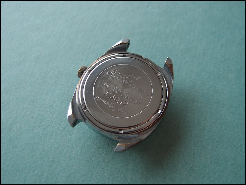 A jedny sovětské hodinky se sovětským věnováním, z října 1979. Dostal je soudruh K.Pavlíček od ?? ????. ??????????? ????? ??????????? ???????a ????????????? ? ???????????????? = Ústřední rada Všesvazové společnosti vynálezců a zlepšovatelů. Rusky už skoro neumím, ale google je mocný....
