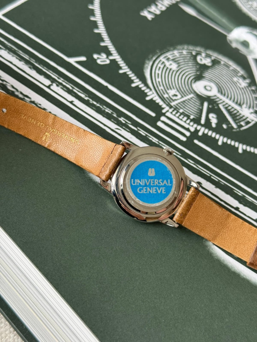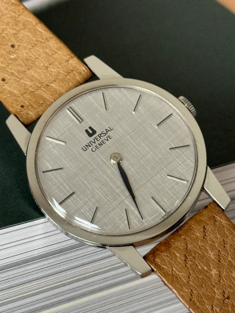 nabízím k prodeji hodinky Universal Geneve - model Altesse, Ultra Slim, ref. 842101 - mechanické hodinky s manuálním nátahem, in-house kalibr 2-42, ve stavu opravdu bez jakýchkoliv známek užívání (žádné stopy po šroubováku, neservisováno, pravděpodobně neotevřeno) bez vlásečnic. Vzhledem ke stáří hodinek je takový stav opravdu unikátní. Hodinky mají ještě původní nálepku na dýnku, samozřejmostí je originální sklíčko, korunka, spona a dokonce i kožený pásek. Cca ze 70. let. Ultraslim pouzdro, výška pouze 7mm.