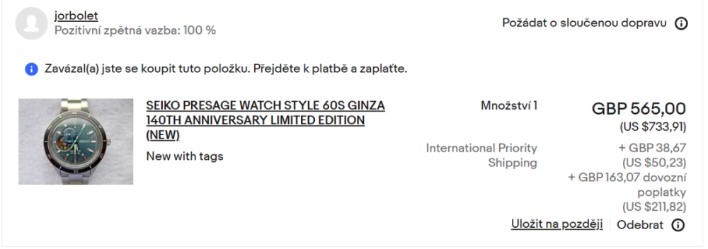Ahoj kluci a holky. Domlouvam nakup na chrono24 od velkeho overeneho japonskeho shopu a po pozadani o cenu hodinek mi je nabidli za 23 289kc. Po sdeleni, ze s DPH a clem je to na me moc a ze dekuji za nabidku mi rekli, ze zasilku mohou deklarovat cenou s hodnotou 150 dolaru a tim padem by se odvijela dan a clo od teto castky? Je mozne to takto obejit? Mate s tim zkušenosti? Je mi jasny, ze to neni 100%, ale jaka je sance, ze to bude ok?