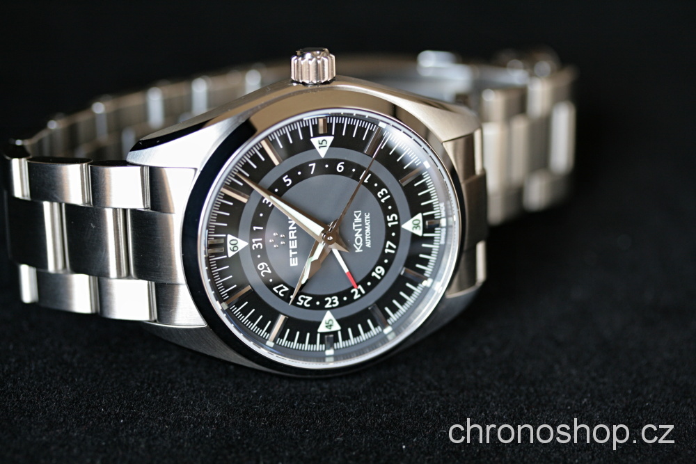 Máme tady skladem nový model KonTiki Four Hands. http://www.chronoshop.cz/eterna-kontiki-four-hands/eterna-kontiki-four-hands-black-steel Pouzdro se zdá být totožné s pouzdrem předchozích modelů KonTiki Date, je tu ale širší a vyšší leštěná luneta, která zvedá celkovou výšku hodinek na 13,2 mm. Dýnko je stejné jako u předchozích modelů - tzn. s medailonem a vyobrazením voru Kon-Tiki. Fotky ještě dodáme.