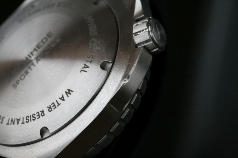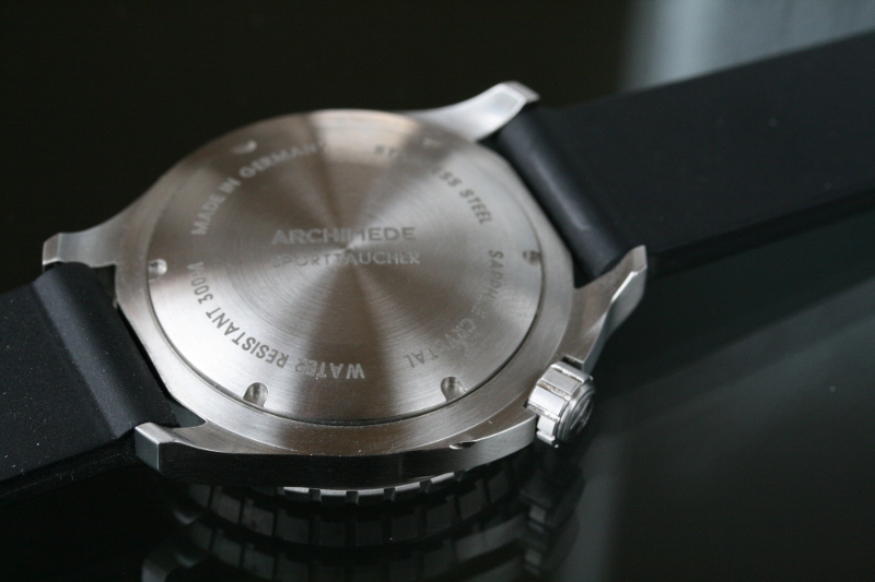 Nově tu máme také Archimede Sporttaucher, záruční list z 20.7.2012, dobrý stav až na jeden hlubší zásek na spodní hraně pouzdra. Viz foto. K hodinkám majitel dodá ještě nový kožený řemen (žralok). Cena: 9.900,-