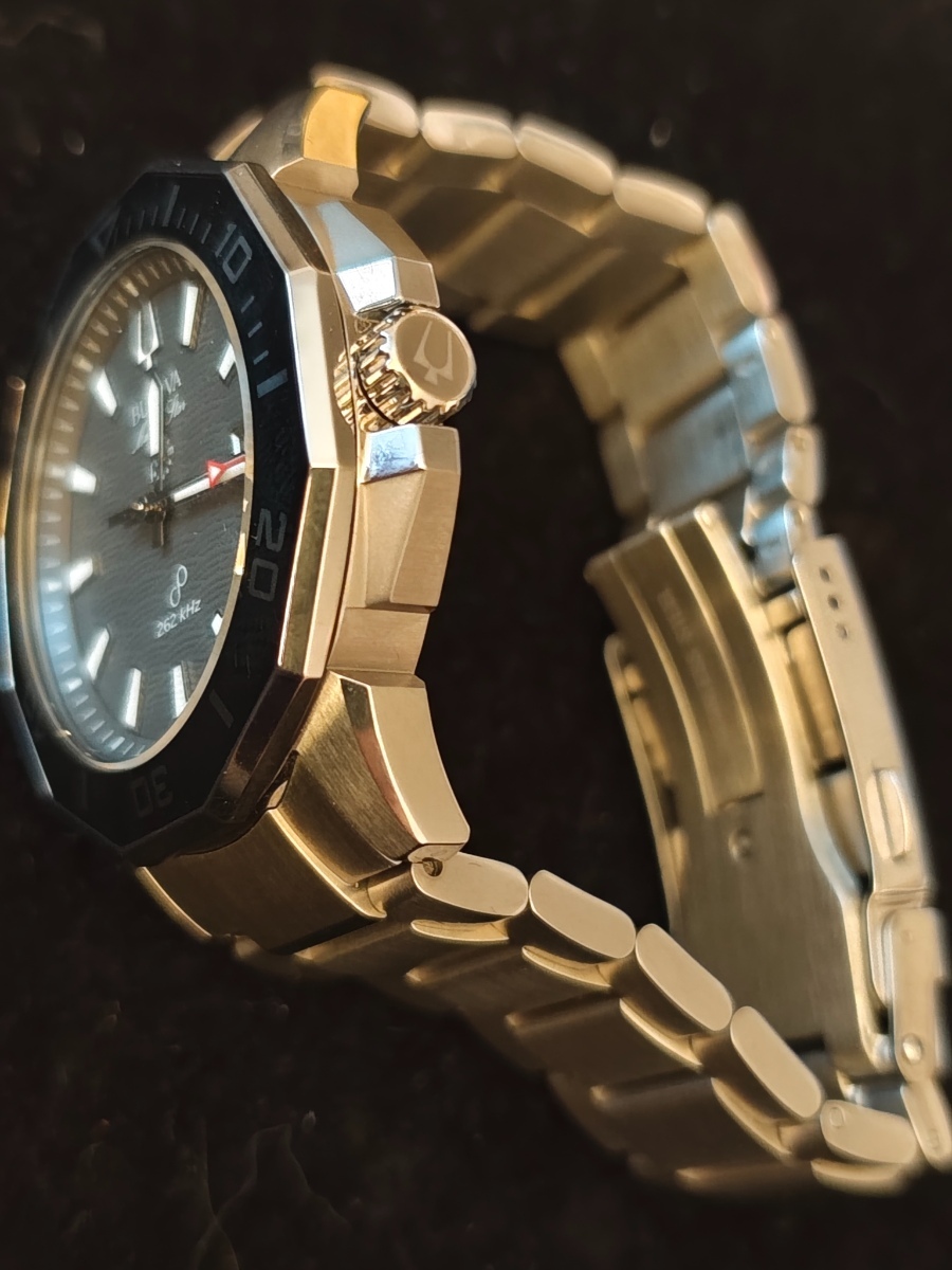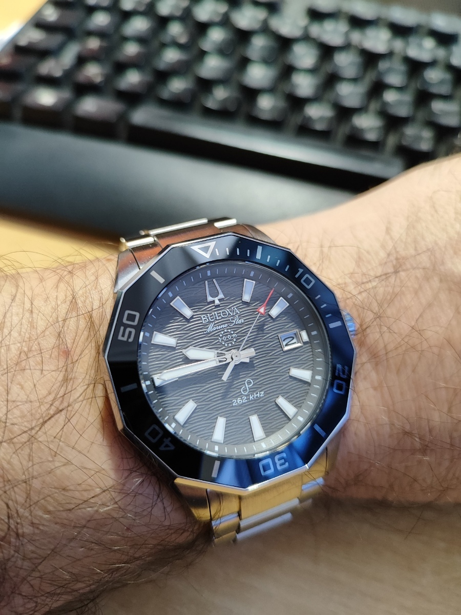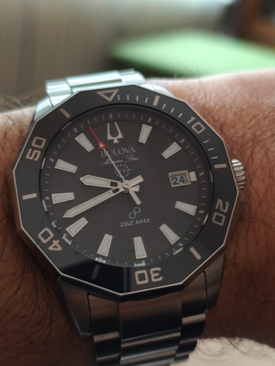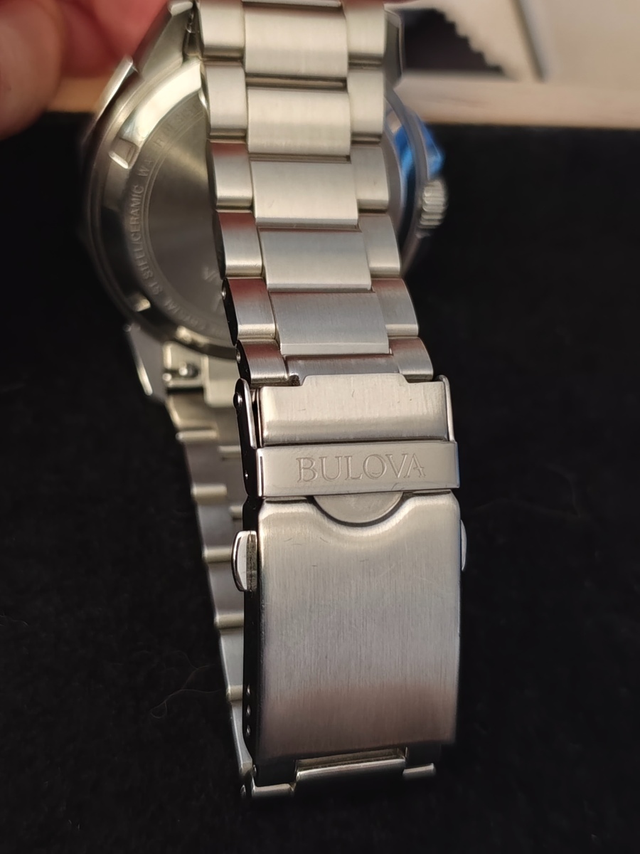 Hodinky jsou to fakt parádní. Zpracování je dokonalé, 200m, safír s antireflexem naprosto čirý, lumi silná a dlouhodobá, takže za všech okolností jsou skvělé čitelné. Jemné vlnkování ciferníku čitelnost vůbec nenarušuje. Pouzdro má broušené boky i masivní ochranu korunky. K tomu dvanáctihranná luneta s keramikou a s leštěnými hranami a plynulá 16Hz vteřinovka, takže na ruce působí jako luxusní automaty, a to i díky hmotnosti. Zkrácené na mou ruku 18,5 cm váží 170g. Přispívá k tomu i kvalitní tah z plných článků, který má ve sponě ještě cca 1,5 cm výklopnou extenzi. Na pojistce spony je nápis Bulova, na korunce logo ladičky. Tah je na rychlospojkách, takže by se dal snadno vyměnit za lehčí 22mm řemínek, ale zatím mě to neláká zkoušet. Odchylka mých hodinek je jak jsem psal -1 sekunda za tři měsíce, takže je není potřeba seřizovat, kromě změny data a posunu času. Nevím jak dlouho vydrží baterka, plynulá vteřinovka má určitě vyšší spotřebu, ale baterka je tam velká 3V CR2016, tak by měla vydržet dostatečně dlouho. Na co je třeba upozornit je to, že, na rozdíl od jiných hodinek s lunetou, na ruce nepůsobí menším dojmem než ve skutečnosti jsou Asi je to tím, že luneta je hodně lesklá. Luneta pouzdro malinko překrývá, a měřená přes hrany má 44,5mm, tak je dobré a tím počítat. Přes plochy má uváděných 43mm. Výhradu k těmto hodinkám mám jen jedinou: na lunetě není lumibod na 12, ani žádné hmatové rozlišení, takže ve tmě ani za šera se podle ní nedá orientovat. Jinak je jednosměrně otočná na 120 naprosto přesných poloh.