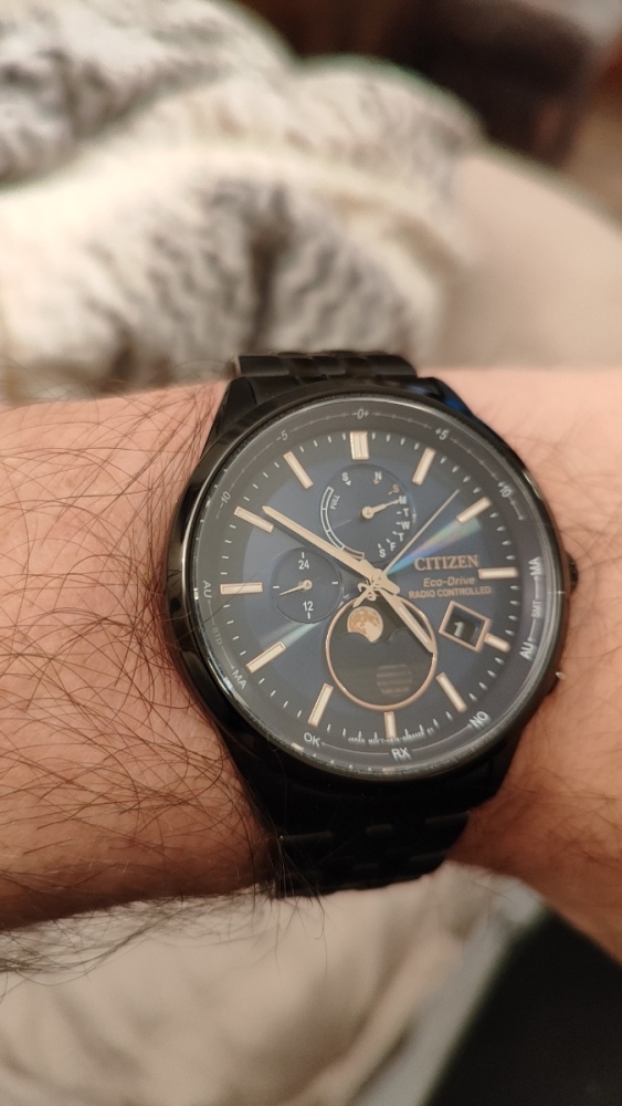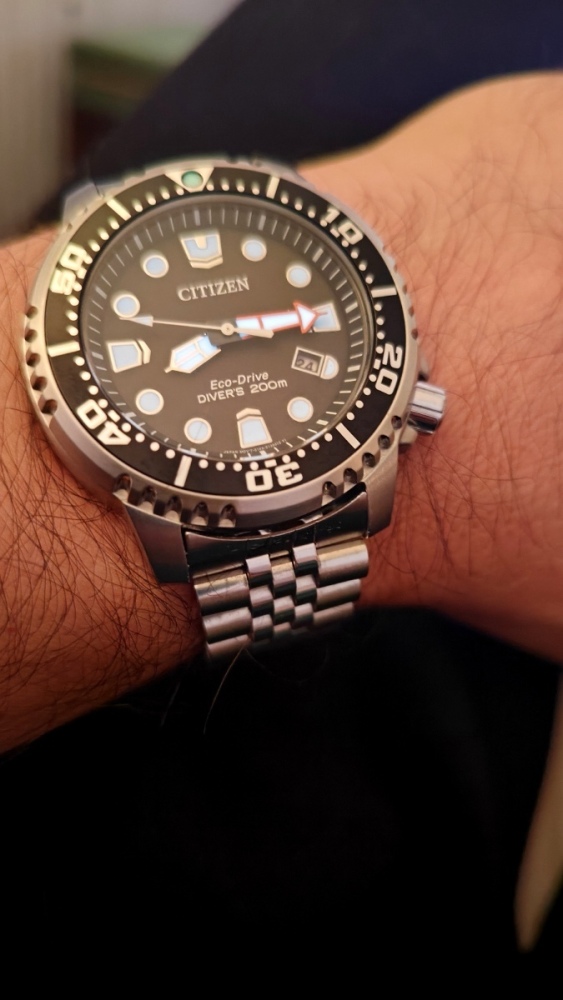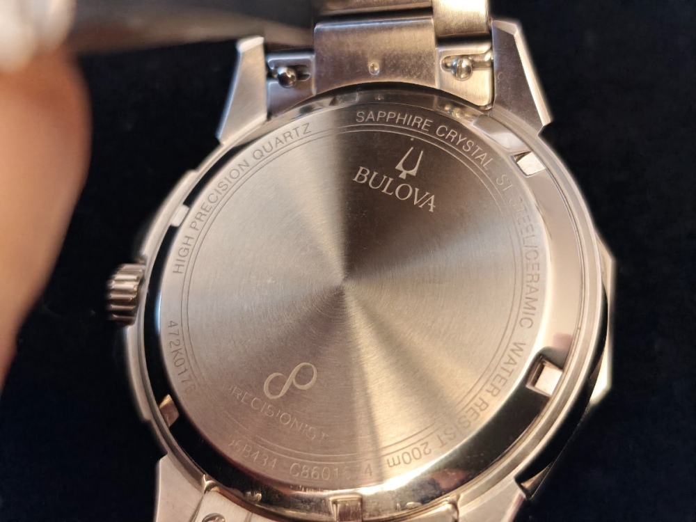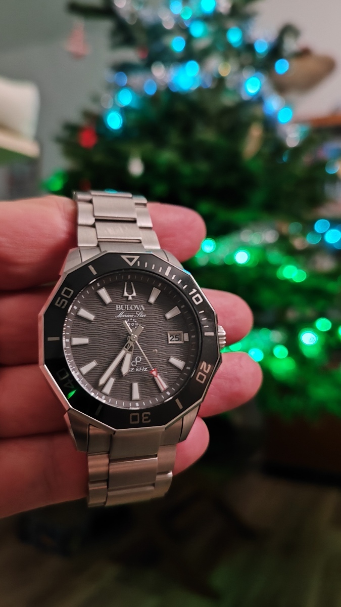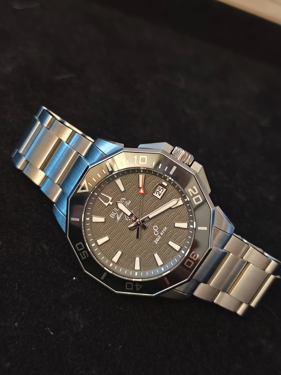 Hodinky jsou to fakt parádní. Zpracování je dokonalé, 200m, safír s antireflexem naprosto čirý, lumi silná a dlouhodobá, takže za všech okolností jsou skvělé čitelné. Jemné vlnkování ciferníku čitelnost vůbec nenarušuje. Pouzdro má broušené boky i masivní ochranu korunky. K tomu dvanáctihranná luneta s keramikou a s leštěnými hranami a plynulá 16Hz vteřinovka, takže na ruce působí jako luxusní automaty, a to i díky hmotnosti. Zkrácené na mou ruku 18,5 cm váží 170g. Přispívá k tomu i kvalitní tah z plných článků, který má ve sponě ještě cca 1,5 cm výklopnou extenzi. Na pojistce spony je nápis Bulova, na korunce logo ladičky. Tah je na rychlospojkách, takže by se dal snadno vyměnit za lehčí 22mm řemínek, ale zatím mě to neláká zkoušet. Odchylka mých hodinek je jak jsem psal -1 sekunda za tři měsíce, takže je není potřeba seřizovat, kromě změny data a posunu času. Nevím jak dlouho vydrží baterka, plynulá vteřinovka má určitě vyšší spotřebu, ale baterka je tam velká 3V CR2016, tak by měla vydržet dostatečně dlouho. Na co je třeba upozornit je to, že, na rozdíl od jiných hodinek s lunetou, na ruce nepůsobí menším dojmem než ve skutečnosti jsou Asi je to tím, že luneta je hodně lesklá. Luneta pouzdro malinko překrývá, a měřená přes hrany má 44,5mm, tak je dobré a tím počítat. Přes plochy má uváděných 43mm. Výhradu k těmto hodinkám mám jen jedinou: na lunetě není lumibod na 12, ani žádné hmatové rozlišení, takže ve tmě ani za šera se podle ní nedá orientovat. Jinak je jednosměrně otočná na 120 naprosto přesných poloh.