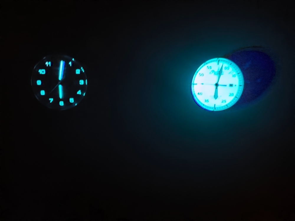 Ta full lumi mě taky zajímala, ale nic moc jsem neočekával. K mému překvapení to svítí úplně brutálně a dlouho. Tmavá fotka je z rána, po krátkém večerním nasvícení baterkou a osmihodinovém uložení v úplné tmě! I tak jsem na nich ráno přečetl čas. Fotka obou hodinek je taky z rána asi 10 minut po nasvícení a s trochou světla z vedlejší mistnosti. Hned po nasvícení to ve tmě fotit moc nešlo, foťák v mobilu se mi oslnil, viz foto č 3.