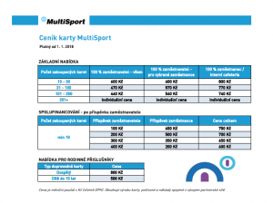 Přidávám ještě info, co jsem dostal. Není to nic tajného :-) Výhody karty MultiSport - úspora nákladů a navýšení čisté mzdy! Zaměstnanec neodvádí daň z příjmů, neodvádí příspěvek na sociální zabezpečení a zdravotní pojištění. Zaměstnavatel neodvádí 34% z hodnoty karty na sociální zabezpečení a zdravotní pojištění. Nedá se za ní pořídit jiné zboží, nehrozí tedy její zneužití z pohledu daňového zákona. Nevýhoda karty Multi Sport - u zaměstnavatele je to nedaňový náklad. Karta MultiSport je určena výhradně k návštěvám sportovních center. Za kartu se nedají získat jiné služby jako návštěva kosmetického salónu či zakoupit proteinové tyčinky. Kartu získá zaměstnanec od svého zaměstnavatele, který má smlouvu s provozovatelem těchto karet, společností MultiSport Benefit, s.r.o. (dále jen ?MultiSport?). Zaměstnavatel hradí společnosti MultiSport náklady spojené s pořízením karty MultiSport. Jaký je daňový dopad těchto nákladů pro zaměstnavatele? U zaměstnavatele se jedná se o náklad spojený s poskytnutím nepeněžního plnění zaměstnanci ve formě možnosti používat sportovní zařízení. Tento typ nákladu je přesně uveden v zákoně o daních z příjmů jako náklad tzv. daňově neuznatelný. Jaký je dopad získání této karty pro daně u zaměstnance samotného ? Výhoda, kterou díky kartě MultiSport zaměstnanec získá, se označuje jako tzv. nepeněžní plnění poskytované zaměstnavatelem ve formě možnosti používat sportovní zařízení. Pokud zaměstnavatel zaúčtoval toto nepeněžní plnění na vrub nedaňových nákladů, FKSP, jiného sociální fondu či ze zisku po zdanění, pak u zaměstnance je tento příjem osvobozený od daně z příjmů. Kdyby tento náklad nebyl posouzen u zaměstnavatele jako nedaňový náklad, musel by zaměstnanec odvádět daň z příjmu. To se však stává velmi zřídka. Další neskonalá výhoda pro zaměstnance i pro zaměstnavatele je, že z tohoto nepeněžního plnění se neodvádí příspěvek na sociální zabezpečení a zdravotní pojištění jak od zaměstnance, tak také od zaměstnavatele. To je významná úspora na čisté mzdě a zejména na celkových mzdových nákladech společnosti. Pořízení karty MultiSport má také své DPH aspekty. Pořízení karty zaměstnavatelem nepředstavuje pro něho plnění, které souvisí s jeho ekonomickou činnosti, proto při pořízení karty zaměstnavatel nemůže uplatnit nárok na odpočet DPH. Při předání karty zaměstnanci se ovšem neodvádí DPH u tohoto plnění. Pokud zaměstnanec uhrazuje část hodnoty karty ze své čisté mzdy, znamená to, že hradí část karty ze své mzdy, která mu zůstává po zdanění a po odvodu sociálního zabezpečení a zdravotního pojištění. Totéž platí i pro zaměstnavatele ? ten také musí odvádět 34% odvodu na sociálního zabezpečení a zdravotní pojištění z hrubé mzdy. Zaměstnanec nikdy nemůže hradit kartu ze své hrubé mzdy.