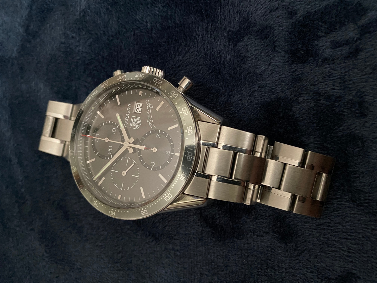 Ahoj, Už jsem tu inzerát jednou měl, ale zapomněl jsem po nějaké době upovat. Hodinky mám stále u sebe, tak obnovuji inzerát: Za kamaráda, mlčícího člena tu mám na prodej moc pěknou limitku. Jedná se o chronografy se závodnickou DNA. Limitovaná edice byla vydaná k příležitosti výročí 50 let od posledního triumfu legendárního Juana Manuela Fangia ve formuli 1. Na ciferníku a proskleném dýnku je proto podpis závodníka. Limitovaná edice čítala 4000 ks. Ciferník má hezký sunburst a mění barvy od skoro černé po světlou šedou. Popis hodinek: Automatický chronograf Tag Heuer. Velikost pouzdra 41mm Strojek Calibre 16 Vodotěsnost 50 m Hodinky mám u sebe a co jsem zkoušel tak funguje. Rozběhnou se hned, chrono nuluje, datum překlápí. Kamarád mi taky říkal, že neobjevil nic, co by nefungovalo. Pouzdro nese známky používání, viz např škrábanec na boku na foto 3, ale zvýraznil jsem to záměrně. Na fotce 4 a 5 je hezky vidět, že v reálu je skoro neviditelný. Stejně tak luneta, která bývá často hodně odrbaná, nese u tohoto kousku pouze lehké oděrky. Celkově bych řekl, opravdu pěkný stav. K dispozici jsou hodinky na kovovém tahu a guma Tag Heuer se sponou Tag Heuer. Dále knížečka s návodem a nevyplněná garanční kartička. Takže vlastně pouze hodinky a dva náramky. Cenu dávám stejnou jako minule, tedy 48 000 Kč. Ale pokud o nich uvažujete a zdá se vám to hodně, tak klidně dejte návrh dle sebe a já to s ním proberu. Maximálně se nedohodneme.