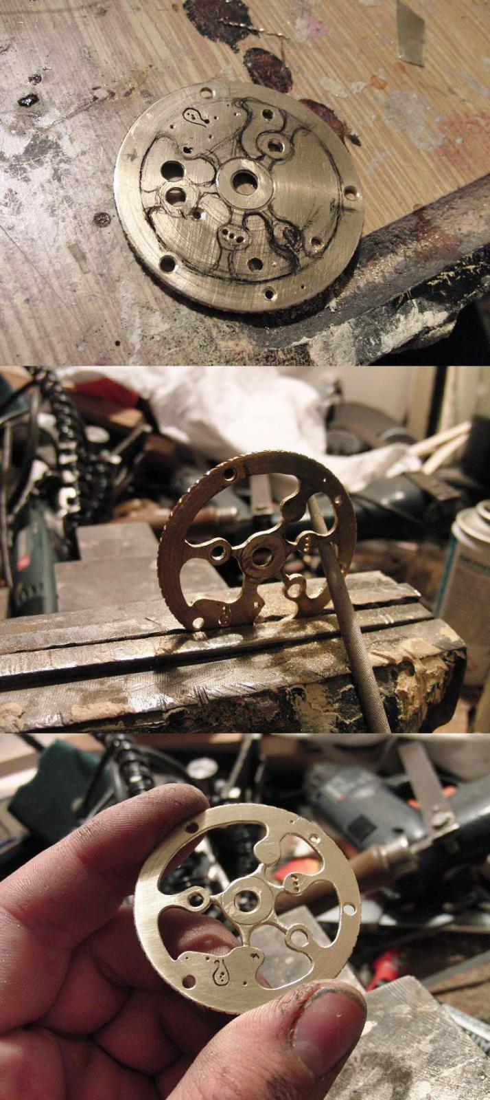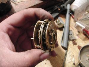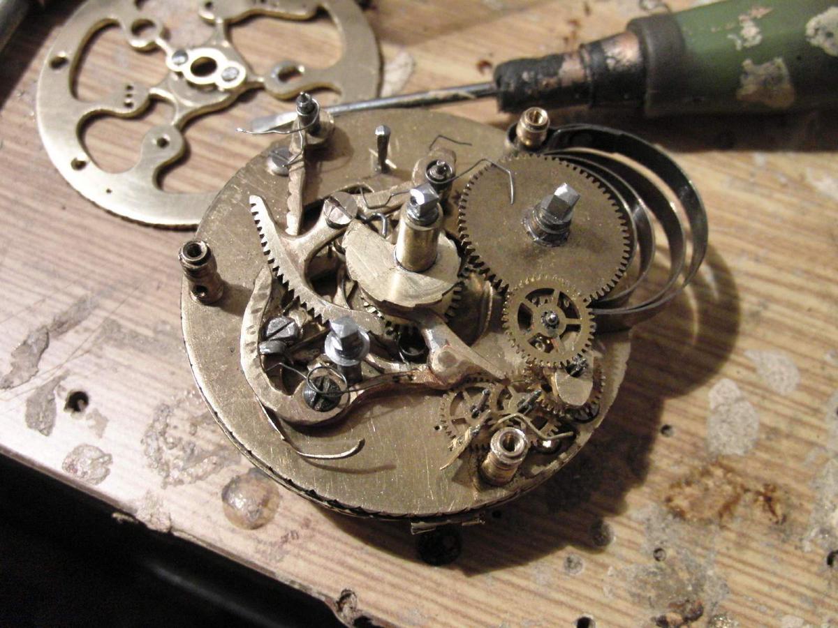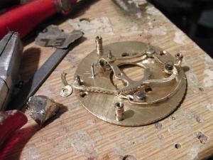 Rád by jsem se vám pochlubil svým novým dílem nad kterým jsem přemýšlel už delší dobu a konečně ho realizoval. Je pravda že ještě není hotovo , chybí ciferník a ručky . To si ale nechávám až na konec a plánuji i lunární kalendář. Takže kde nestačí výplata , musí zasáhnout kutil. Velice jsem toužil vlastnit bicí špindlovky ,ale asi tu nemusím vyprávět na kolik taková věc příjde. Nakonec jsem na Aukru zakoupil torzo špindlovek za 800,- a pustil se do díla. Strojek jsem celý zrenovoval a uvedl do chodu , akorát řetízek byl potrhaný a když jsem pospojoval všechny části , zjistil jsem že není dost dlouhý na plné natažení a dojde poslední půlotáčku před koncem. Ze strany ručiček jsem navrtal dva otvory se závitem M2 který budou držet celý bicí mechanismus. Odbíjení jsem nezvykle na hodinky udělal jako u pendlovek - půlové s opakováním. Chtěl jsem aby jsem si mohl kdykoliv poslechnout kolik je . Ale tak úplně to nevyšlo ,protože špindlostroj je poměrně slabej a má problémy aby minutová ručka připravila mechanismus k bití. Vyřešil jsem to tak že se pomalu natahuje celou půlhodinu těsně po odbití a tak je možné opakovat pouze 4 minuty po posledním bití než se nátahem zablokuje bicí stroj a uvolní se až v době dalšího bití.