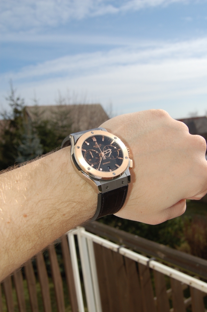 Ahoj, jen jsem se chtěl podělit o pár fotek celý název hodinek je Classic Fusion Chronograph Titanium Gold, velikost je 45 mm. Sám jsem překvapenej, jak klamou. Před půl rokem bych na ně ani nepomyslel, vlastně na celé Hublot. Vím, že hodinky Hublot nejsou na chronomagu zrovna oblíbené. ref. 521.NO.1180.LR