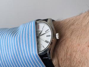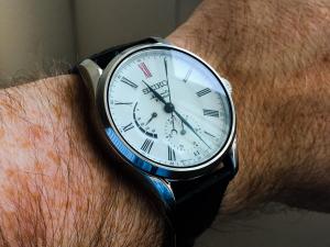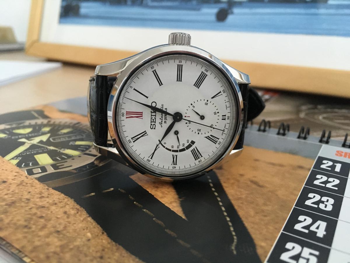 Po SEIKO náloži od Matthiase mi to nedalo a zabrousil jsem na JP aukce a dopadlo to takto: Seiko Presage SARW005 100th Anniversary of Laurel je limitovaná edice 500ks vydaná v roce 2013 pro japonský trh na počest 100 let od prvních Seiko náramkových hodinek tzv. Laurel. Zvláštností této limitky oproti běžné produkci je smaltovaný ciferník a červené indexy na XII a 1 u datumového subciferníků. Limitka byla ihned vyprodána a nedá se moc sehnat. Několik technických parametrů: Pouzdro: rozměr 40,5 x 13,3 x 48 ? na oblekovky je to hraniční, zejména výška pouzdra (škoda že nejsou velikostně jako SARB035). Nicméně tvar pouzdra tomu trochu pomůže a i na ruce 16,5 a 17cm se dají nositkomplet leštěnkyzadní průhled na strojek (asi safír)mírně klenutý safírsignovaná korunkaWR 10Ciferník: ručně vyráběný smaltovaný ? mírně plastický/zahloubený ve stření části a u ?subciferníků?barva bílá - je to taková zvláštní příjemná bílá, slovy těžko popsatelná ani leskla ani matná, prostě akorát ?díky ukazateli rezervy nátahu na 9h a ukazateli dne na 6h je ciferník vyvážený a působí trochu ?chronografově?Římské indexy moc rád nemám, ale v tomto případě mi sem sedí a celkový dojem ?velkých oblekovek? zjemňují a červené indexy na XII a 1 ciferník oživujílistové ručičky krásně doplňuje vteřinovka s měsícem na konci Stojek: spolehlivý automatický 6r2729 kamenů a 28 800 bph ? (vyšší frekvence proti 6r15, který má 21 600 bphvlásek Spron 510rezerva nátahu 45hlehce zdobený rotor (pruhy, zlaté popisky) Řemen: 20mmOEM černý Seiko řemen, je snad nejslabší článek hodinek (vidno na fotkách) - určitě by si zasloužily daleko kvalitnější a pohlednější, než tu bídu, co k tomu dodávali (už vybírám nějakého aligátora na Strapshopu ? asi tmavě hnědého). Původní nechám jako relikvii a odstrašující případ pro další generace :-)na druhou stranu překlápěcí signovaná přezka se jim povedla Několika fotkami z telefonu se pokusím dokreslit povídání výše. Bohužel smalt na fotkách jde zachytit dost špatně.