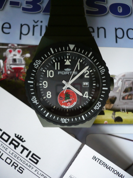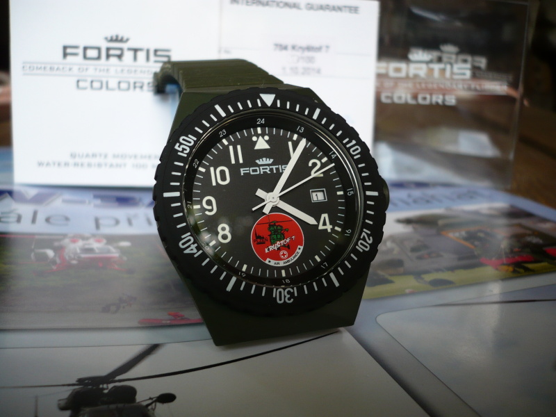 Zdravím všechny co mají rádi něčím zajímavé hodinky. Dnes 1.10.2014 světlo světa oficiálně spatřilo 100 kusů hodinek FORTIS KRYŠTOF 7 což jsou vlastně Fortis Fliper colors, řemen je zelený silikon (704.10.185.2) a já měl tu možnost a dovolení je zde zveřejnit Foto je dle mých možností Hodinky se bohužel nebudou fasovat, ale kupovat za vlastní penízky. Dle mých informací hodinky vytvořila firma Fortis dle podkladů společnosti NEST a ZENIT jako pocta vrtulníku W-3A SOKOL, nemálo už životů zachránily rychlým vzdušným převozem a HLAVNĚ LIDIČKÁM, kteří se podílí jak na záchraně životů, tak na provozu a údržbě těchto strojů. Takže když tyto hodinky uvidíte u někoho na ruce, aspoň v těchto prvních dnech, určitě bude patřit k personálu. Bude to buď doktor, sestra, záchranář, pilot, palubní technik, letecký technik různých odborností A pro nezasvěcené KRYŠTOF 7 (nebo i Kryštof 07) je volací znak a všeobecně rozšířené označení vrtulníku letecké záchranné služby (LZS) v Plzeňském kraji. Pár pokusů o foto hodinek