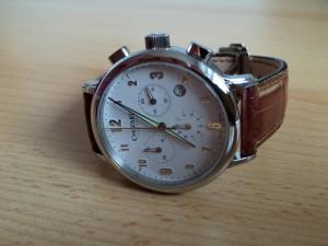 Sice se tu pochlubím, ale bohužel cizím peřím... Byl jsem nominován rodinnými příslušníky pořídit jeden z darů k otcovým narozeninám. Zadání: elegantní sportovní, skoro oblekovky, chrono, limit max. 15 tis., quartz. Sám jsem si přidal ještě podmínku, aby nebyly moc okoukané. Po několika hodinách strávených u netu, na fórech, jsem nakonec zakotvil u www.christopherward.co.uk u modelu C3 Malvern Chrono v bílé barvě. Sice jsem přesvědčoval členy rodiny, že by rozhodně stálo za to navýšit trochu rozpočet a jít do opravdu velmi vyvedené limitky C30 Malvern Chrono, ale byl jsem bohužel "uťat". No nic, co se dalo dělat, hodinky jsou i tak parádní (dal jsem jim přednost před Tissot), zadal objednávku - proti standardu navíc s řemenem z krokouše a překlápěcí sponou, zaplatil a čekal... celé 4 dny, než dorazil balíček ze Anglie do Čech. Dorazilo ve zkratce toto: Průměr: 39mm, Výška: 10.2mm, Kalibr: Ronda 5040.D, Pouzdro:316L stainless steel, Voděodolnost: 5 ATM / 50 m, Šířka řemenu: 18mm, sklo: safír s antireflexem, šroubovací korunka, chrono s ukazatelem 1/10s na "6. hodině" Měl jsem docela strach o velikost, původně jsem měl představu průměru pouzdra 40-42mm a šířka řemenu 18mm také není moc, ale s tátou máme poměrně úzké zápěstí (já 17cm, táta lehce víc - tak 17,5cm), tak jsem to risknul s 60 denní zárukou na vrácení. Musím říct, že první pocity jsou veskrze pozitivní, velikost 39mm je na mé ruce akorát, pravda řemen by mohl být širší, ale konstatoval jsem, že mi to vlastně vůbec neva. Kvalita zpracování je opravdu příkladná, ostré hrany, vysoký lesk až oči přechází, pevný a jistý stisk tlačítek, přiměřeně tuhá korunka. Nenašel jsem na nich zásadní vadu a směle beze studu je můžu vystavit vedle tchánových Béček Navitimerů (i když co se týče velikosti to bude bitva Davida s Goliášem). Ke kalibru asi není co dodat, quartz byl podmínka, takže swiss Ronda. Nic zajímavého krom subdialu 1/10s při spuštěném chronu - zvlášť v noci, když svítí lumi je to pěkný kolotoč... :-) Cifr jsem vybral bílý, ale alternativně je k mání i stříbrný a černý, lumi je myslím dostatečná... Suma sumárum si říkám, že jsem vybral velmi dobře a táta bude potěšen... (doufám) No ale dosti řečí, ať zbytek dopoví obrázky... (omlouvám se za fotky z mobilu, zrcadlovka bohužel putuje po světě s manželkou...)