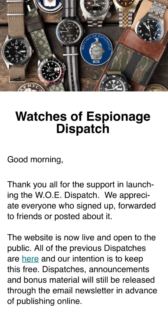 Ak ste este nezaznamenali, tak jeden z byvalych agentov CIA si zalozil ucet na Instagrame, a zdiela tam veci k svojim hodinkam ako aj guest posty od ludi zo sveta spionaze, specialnych jednotiek a pod. Vysli mu aj nejake clanky na Hodinkee, a konecne rozbehal aj web a newsletter - nevahajte sledovat . F.