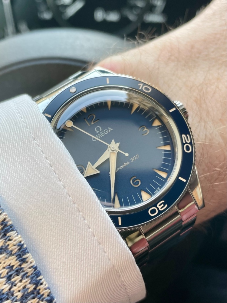 Po zhruba dvou měsících od pořízení jsem se konečně odhodlal napsat pár postřehů ke svému novému přírůstku v podobě Omega Seamaster 300 ref.: 234.30.41.21.03.001, tj. v jejich pro mne zásadním "faceliftu" z roku 2021, který přinesl spoustu "malých" změn, v důsledku kterých se pro mne tento, v původním provedení nezajímavý model, proměnil ve splněný hodinkový sen. Co se tedy změnilo, když na první rychlý pohled vypadají hodinky téměř stejně. Bez nadsázky lze tvrdit, že v podstatě všechno. Pouzdro se snížilo o téměř 1 mm z 14,7 mm na 13,85 mm, takže nyní mají hodinky nižší siluetu a lépe sedí na ruce díky vhodnějšímu rozložení váhy. U nového modelu mají obě základní varianty (černá a modrá) pouzdro i tah v oceli, stará varianta nabízela modrou pouze v titanu. Ciferník a sklíčko se zvětšilo o půl milimetru, kdy tento vytříbený poměr velikosti ciferníku a lunety s sebou nesl celou řadu dalších pozitivních změn. Díky tomu se ztenčil kovový prstenec okolo sklíčka, který by na předchozím modelu na můj vkus až neforemně tlustý. Adekvátně této změně se též prodloužily ručky a tím nabyly elegantnější siluetu. Sklíčko je nyní výrazně "double bubble domed" dodávající hodinkám plasticitu oproti poněkud placatému vzhledu předchozího modelu s lehce klenutým sklíčkem. Ciferník nového modelu je řešen sendvičovou konstrukcí ze dvou vrstev, zatímco předchozí model měl pouze jakési prolisy v nichž byla lumi zapuštěna. Lumi je nyní i v číslech, které musely kvůli této konstrukci dostat u šestky a devítky otevřený font písma. Na ciferníků též výrazně ubylo zbytečných nápisů. Luneta je nyní hliníková s anodizací pro větší odolnost, oproti tomu předchozí model měl lunetu keramickou s kovovými indexy, tj. z materiálu liquidmetal. Hliník je mnohými vnímán jako krok zpět, ale za mne i v tomto směru došlo k pozitivní změně harmonizující celkový vintage feeling tohoto modelu. Luneta má opravdu nádherný sametový odstín perfektně ladící ciferníku a navíc obsahuje luminiscenci, která mimo svícení též barevně ladí s indexy na ciferníku. Původní kruhová korunka dostala elegantnější ke konci rozšiřující se tvar. Zmizela podivnost spočívající v bílém nátěru vteřinové ručky odlišující ji od ostatních kovově lesklých ruček. Změnil se i strojek, a to zejména METAS certifikací, kdy už i původní model měl dva barely pro delší rezervu nátahu, ale hlavně pro držení přesnosti po celou dobu nátahu od plně natažených až téměř po zastavení. Nově je strojek kryt NAIAD dýnkem. Změnilo se i provedení tahu, který má na místo leštěného středu a broušených boků přesně opačnou konfiguraci. Od broušeného středu nového provedení lze očekávat menší náchylnost na drobné vlásečnice, zatímco leštěné boky lépe opticky navazují na leštěné nožky. Tah se výrazněji zužuje z 21mm na 16mm (původní tah se ze stejné hodnoty ztenčoval pouze na 18mm) s mikroregulací ve sponě dodávající dvě přidané polohy. Tah lépe obepíná ruku (zvláště máte-li ji tenčí), neboť střední dílek navazující na pouzdro je zkrácený oproti bočním, u starého modelu to bylo naopak, což pocitově prodlužovalo délku hodinek jakoby měly větší lug to lug rozpětí. Všechny shora popsané změny osobně považuji za přínosné, většinou došlo k nespornému technickému vylepšení, či (jako v případě použití hliníkové lunety) ke sjednocení jednotlivých částí vzhledem k celkovému charakteru hodinek. U obou provedení tohoto modelu je často diskutována barva luminiscenčního nátěru v odstínu falešné patiny starých tritiových hodinek. Slyšel jsem i poněkud osamocené názory, že se o žádnou faux patinu nejedná, že je to jednoduše barva v takovém odstínu, která se nejlépe hodí k barvě ciferníku. Ať už je pravda jakákoli, musím říci, že k modrému ciferníčku tento odstín pasuje skvěle, určitě lépe než by mohla k němu až příliš kontrastní bílá obvyklého luminiscenčního nátěru. Zajímavé je provedení ruček tohoto modelu, kdy je každá v úplně jiném tvaru, hodinová "arrow", minutová "dauphine", (stejně jako na některých Speedmasterech, ale přesně naopak než na modelu Aqua Terra) a vteřinová ve tvaru lízátka "lollipop" (tj. podobně jako na bondovském modelu Spectre, kde však byla v bílém lakování). Na ruce hodinky sedí skvěle, modrá barva je mimo přímé světlo hodně temná a s rostoucím osvětlením se krásně mění do středně světlých odstínů. Luminiscence je po přímém nasvětlení o něco málo méně zářivá než třeba na bondovkách, které ji mají v rezervoárech aplikovaných indexů, vydrží však svítit zhruba stejně dlouho. Kvůli skeletonizovaným ručkám bondovek jsou pak tyto třístovky v průběhu noci mnohem lépe čitelné. Minutová ručka a pip na lunetě mají zelený nádech zatímco vše ostatní svítí modře. Závěrem přidávám pár fotografií: