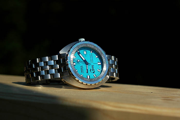 Dovolte mi nejdřív pár osobních slov úvodem: Během cesty chronomagem jsem - v rámci řešení dokonalých diverů pro sebe - prošel obdobím, kdy jsem se intenzivně zajímal o kultovní řadu potáp?čských hodinek Doxa Sub. Prolézal jsem internet, stahoval texty, četl o historii těchhle dokonalých toolů, domlouval si chronopiva s majiteli různých modelů. Postupně jsem se propracoval k poznání, že standardní velikost shodná s původním historickým modelem je na mou ruku příliš malá a vypadá vintážn?. Přijatelnou variantou se tedy jevil pouze nákup některého z větších modelů (750T, 1500, 5000) nazývaných skalními příznivci původní velikosti "Doxy Sub na steroidech..." Další výběr už byl snadný - oranžové klasiky Professional, stříbřité Searamblery, tmavě modré Caribbean i černé Sharkhuntery... všechno šlo bokem, jakmile jsem uviděl sv?tlemodrý, lehounce do tyrkysova zbarvený ciferník limitky Project Aware II. Fantastická, unikátní, naprosto letní barva mi okamžitě připomněla barvu mělké vody na atolech i zbarvení sladkovodních jezírek v tropických krasových oblastech, kde jsem v minulosti lovil ryby a na které mám skvělé vzpomínky. A kromě barvy jako bonus dobrý pocit z Aware Projektu (velmi zjednodušeně projekt na ochranu mořského prostředí, se zvláštním zřetelem na ochranu žraloků a mapování život ohrožujících objektů v moři (typicky zkytky velkých vlečných sítí). Nebylo co řešit... Začal jsem zjišťovat možností nákupu na amerických stránkách http://www.doxawatches.com/sub1500t_project_AWARE_2.htm brzy se ukázalo, že velkou nevýhodou americké distribuce bude jak daň, tak velmi zvláštní přepočet kurzu eura a dolaru. A pak se zčistajasna objevily tady, v naší inzerci, od zahraničního člena a byly moje. Po pár dnech Awarky dorazily pečlivě zabalené, v klasické doxácké tub?, dal jsem je na ruku a mé nadšení neznalo mezí. Barva byla přesně taková, jakou jsem znal z mého mizern? zkalibrovaného monitoru; zpracování povrchů na výborné úrovni; rozměry a váha supertoolů; komfortní mikroregulace spony, šroubovaný tah i stěžejky. Bohužel, kromě Awarek jsem nosil samé nízké, pohodlné, lehké hodinky, takže jsem na jakékoliv cesty mimo domov nakonec sáhnul po jiných značkách a Doxičky se postupně dostaly do role "hodinek do bazénu", což mi u hodinek za více než 50k už přišlo jako trochu velký luxus. Definitivní tečku pak udělal příjemný večer v hospůdce se Sphinxxem, který kolem nich delší dobu mlsně chodil a který vidíce mé rozpoložení, nabídl mi výměnu za Omegy PO a rozpoutal tak opět démona chronobundu. Transakce mi na jednu stranu udelala velikou radost díky nové, dokonalé akvizici, na druhou stranu ale přišla v nejméně vhodný okamžik, protože jsem měl o Doxách rozd?lanou recenzi. Protože mi bylo líto fotky a zárodky textu mazat, po dohodě s novým majitelem jsme se rozhodli vložit sem alespoň fotorecenzi s trochou textu. Limitovaná edice vyrobená v počtu 300 ks má rozměry pouzdra 45 mm šířka bez korunky a 15 mm výška. Ciferník má průměr 30,2 mm, luneta 40,8 mm. Náramek je u st?žejek široký 22 mm, lug to lug je 48 mm. Pouzdro je zvrchu s brusem, boky a luneta jsou lešt?né Velice pohodlná spona s mikroregulací Detail solidního šroubovaného tahu Bude pokračování