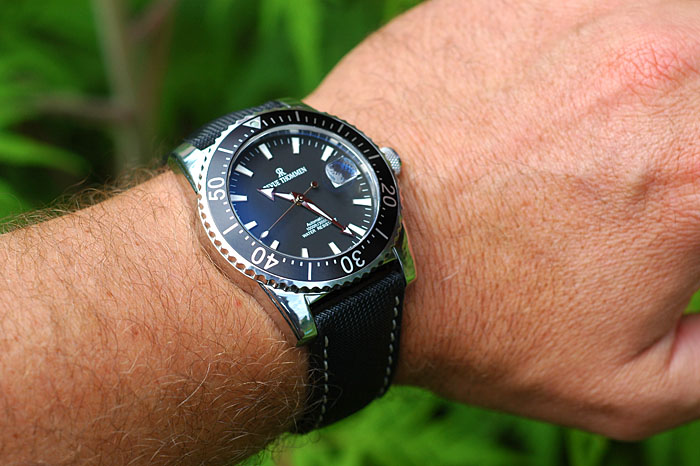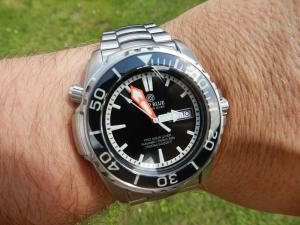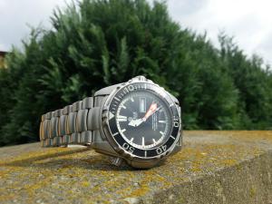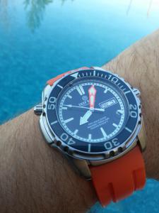 Zdravím kolegové chronopacienti k výročí mého 200 příspěvku zde na fóru, se rád podělím s pár postřehy o festovních potápkách s poctivou seiko strojovnou. Má cesta k DBečkám : Potápky mě zpočátku vůbec nezajímaly, ale znáte to, recenze tady, nějaké fotky v chlubícím vlákně, ale jasný impuls jsem dostal na jarním ostravském chronosrazu, kde jsem si prohlídl Rolexky, Kemmnery, monstra, prostě najednou jsem potápky musem mít . A začal proces hledání s jasným cílem: potápky, automaty, otočná luneta, 45 mm velikost a cena řekněme lidová. Chvíli byly v hledáčku Steinharty Ocean 1 Black, ale velikost 42 mě nakonec poslala dál hledat ve vodách chronomágu. A tu, najednou, jsem objevil ve starém prodejním vlákně ty ideálně velké a čím vícekrát jsem to vlákno četl, tím víc jsem je chtěl. Takže jsem napsal současnému majiteli, jestli by je nechtěl prodat. Uhodl jsem ! Nechtěl. Takže jsem se jal ukecávat polské zastoupení Deep Blue ( atomictime.pl), jestli by mi je nechtěli prodat s nějakou fakt dobrou cenou. Zase jsem uhodl. Nechtěli. Ale nakonec se bůh času Chronos na mě usmál a místní člen mi nakonec Dbčka prodal. Takže jsem se stal majitelem potápek DEEP BLUE PRO AQUA 1500 BLACK a jak psal Frantík byl jsem šťastný takže k samotným tikáčům : Balení: DBčka se ke mně dostaly zabalené v original DEEP BLUE černém kufříčku, uvnitř vypolstrovaném, plný ocelový tah signovaný, černá guma se signovanou sponou + další guma a řemen od předchozích chronomajitelů....prostě paráda Technické údaje s komentářem: Průměr : 45 mm ? můj základní požadavek splněn byl, bonus pro váhavé s užší ručkou je, že luneta má 42 ? 43 mm tudíž nepůsobí tak masivně, jak by se mohlo zdát. Výška : 16 mm ? hodinky mají dýnko pěkně buclatě vypouklé, nožky jdou lehce do protioblouku. Na té mé 21 ručce mi přijdou až lehce subtilně i když váhu cítím a tudíž vím že je prostě MÁM. Rozteč nožek: 24 mm - super myslím, že na velikost pouzdra ideál, k velikosti majitele 2x ideál Kalibr : Seiko NH36 ? na tento strojek nemám nejmenší stížnost, hacking, možnost manuálního nátahu, větší den/datum (oči už ty prťavé parchanty někdy nedávají), příjemně modrá sobota, neděle je obligátně červená. Hoďky asi dostaly ránu, neb mají na levém boku zkosenou hranu (no dobře, mi taky spadly a chytal jsem je nohou, ale chytl !), tudíž se, myslím, o 20 vteřin denně zpožďovaly. Po zásahu pana hodináře Mirka Janáče, šlapou +-3 vteřinky, takže pohoda. Korunky: první na trojce signovaná a šroubovací, na 9ce heliová, obě s výraznými drážkami pro pohodlné šroubování. Luneta : 120 bodová, jednosměrně otočná, krásně klikající, trochu jako račna, ale hlavně safírová s lumi-indexy. Sklo : safírové, furt ho leštím , tady je třeba říct, že nijak nevystrkuje růžky nad lunetu a je tedy chráněná spolu s lunetou, která je vsazena do ocelového prstence, takže oboje parádně chráněno. Pouzdro : masivní ocelové, čelní strana kartáčovaná, boční strany pískované ( satinované ?) Pouzdro je docela komplikované, chrání korunku, druhá strana je tedy symetricky taky tvarovaná, má mezi nožkami nos ( nahoří i dole), jehož účel jsem pochopil až po čase, kdy jsem si hrál s hodinkama na tahu a měl jsem je překlopené sklíčkem dolů a ejhle najednou je koukám, ten nos je takové geometrické pokračování dýnka ? super. Ciferník: Černý, ale fakty černý ! S lehkým sunburst efektem, bez čísel, s plně indexovaným kruhem, popisky jednoduché v barvě starého stříbra (taky semo tamo hodí na sluníčku prasátko) včetně rámečku kolem datumovky. Ručičky: tedy díky článku od místního člena Javy, zde můžu zamachrovat a mít odborný názor, že ciferník těhle Dbček hodně vycházel ze slavných hodinek OMEGA ?Ploprof? Seamaster 600. Za což jsem tedy hodně rád, protože místní Rolex plantážníci , rádi všechny levnější potápky hrozně dehonestují s odkazem, že to je jen levná napodobenina ROLEXEK .. ok tohle tedy je super inspirace z Omeg !! Luminiscence : modrozelená a jednoznačně brutální !!! Jedna z nej co jsem na foru viděl. Tah : typ END-MILL hodinkám "mocinky" sluší, vše plná ocel, žádny plech. Mě osobně hodinky nejvíc bavily na noname oranžové gumě. mistr Zrno dodal 2 parádní řemeny jeden v barvě luminiscence a druhý krasavec ke mně připutoval spolu s mými pilotkami, tam mi koresponduje krásně s minutovkou. Prostě léto DBčkama bylo parádní, ještě pořád na nich něco objevuju a na jaro si k nim asi ještě pořídím origo mesh... A hlavně, od doby co je mám, jsem zatím nenašel jiné potápky " co bych musel mít ", takže v tomhle směru se zatím, aspoň pro mne rozhostil chronoklid. PS I když už jsem starší týpek, už od školy mám problémy se souvětím, buď čárky chybí nebo přebývají... Omluvte tedy kvality autora tohoto příspěvku, jeho neodbornost apod. pokud jsem někdo něco spletl, pak tedy s dobrým úmyslem a neváhejte popřípadě mé údaje opravit.....