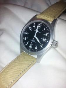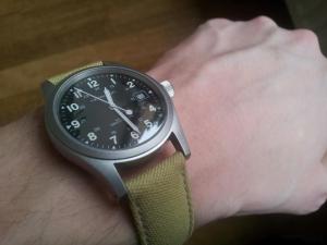Zdravím vás přátelé, Přestože jsem na tomto fóru registrován poměrně krátce a moje chronocesta není, alespoň ve srovnání s některými z vás, zdaleka tak rozmanitá a akční, rád bych se v tomto vlákně s vámi podělil o mojí čerstvou hodinkovou radost. Pravdou je, že hodinek jsem mnoho za život nevystřídal. Jednak proto, že jsem se s Chronomagem seznámil (naštěstí) teprve před cca rokem a čtvrt, a jednak proto, že v tuto chvíli stále ještě studuji a peníze na kupování hodinek úplně nejsou. Zasažen tímto fórem, začal jsem si více všímat a oceňovat hodinky mechanické, až jsem je začal oproti quartzovým zcela upřednostňovat. Dva poslední roky jsem nosil automaty, ale pořád to tak nějak nebylo ono. Samonátah byl sice pohodlný, ale přeci jen, nejsem úplně zvyklý nosit hodinky vždy a ke všemu a na víkend je např.často sundavám. Tím pádem mě po čase začalo trochu vadit, že se mi zastavovaly a musel jsem je vždy opět seřizovat. Moje chrono obzory se pomalu rozšiřovaly, láska k mechanikám rostla a tak jsem si řekl, že prostě musím vyzkoušet hodinky na ruční nátah, že mě to bude bavit a třeba to pro mě bude i praktičtější, zakroutit si ráno korunkou, dotáhnout a vedět na čem jsem. Při brouzdání na internetu jsem narazil na model Hamilton Khaki Field Officer Handwinding (dříve také pod názvem Mechanical Officer), který vychází z historického modelu, kterým značka Hamilton zásobovala během války americké vojáky. Tak jsem to alespoň četl. Každopádně nebylo co řešit. Do hodinek jsem se zamiloval. Líbila se mi jejich jednoduchost, čitelnost, absence jakýchkoli zbytečností, snad s jedinou komplikací v podobě datumovky, kterou naopak v každodenním životě používám. Jediné co mě trochu znervózňovalo byla velikost 38 mm, neboť doposud jsem nosil hodinky o vel. 43,2 mm. I když buhvíjak silnou ruku nemám (obvod cca 18 cm), bál jsem se aby nepůsobily dětsky. Z tohoto důvodu jsem kontaktoval jednoho místního člena, který je má, zda by nebyl ochotný se sejít a půjčit mi je na ruku (AD tento model objednává pouze závazně až po zaplacení, a na slepo se mi do toho jít nechtělo). Hodinky na schůzce předčily mé očekávání, seděly skvěle a tak jsem je závazně objednal a zaplatil. Od objednání 22.12.14 po včerejší doručení 23.1.15 to tedy dělá přesně jeden měsíc čekání. 38 mm, ETA 2804-2 na ruční nátah, safírové sklo, WR 50 m Tady jsou: První dojmy (opravdu jen ty nejčerstvější protože je mám doma jen den): Hodinky jsou lehké jako pírko a opravdu tenounké, člověk o nich na ruce po chvíli ani neví. Zpracování je v reálu perfektní. Bál jsem se jakožto začátečník toho natahování, hlavně že nebudu vědět kdy přestat kroutit a hodinky rozbiju. Jde to ale lehce jako po másle, s tichým "clicking" zvukem, rezistence pomalu stoupá ale člověk pak lehce pozná, kdy je konec neboť už to prostě nejde. Zároveň jsem si všiml, že opravdu hezky a relativně nahlas tikají (když je v místnosti ticho, člověk je slyší na dálku). Když jsem je před spaním položil na poličku nad postelí, přítelkyni to tikání dokonce chvíli vadilo, ještě jak strojek rezonoval o tu dřevěnou poličku bylo to tikání zesílené. Abych jen nechválil, i když se nejedná o žádnou tragedii, pravda je, že lumi je docela bídná a rychle hasne. Docela mi vadí tuhost toho továrního řemínku. I když je to canvas, dole je podšitý kůži a přijde mi že je docela rigidní a hodinky tak celkem odstávají od zápěstí. Kolikrát jak kdyby vůbec nebyly v kontaktu s rukou. Ale přijde mi, že už to trochu povoluje a bude to snad lepší. No a na tu světlou pískovou barvu si taky zvykám, ale určitě se porozhlédnu po nějakém novém obutí. Jako poslední výtku, která mě teď napadá je že hodinkám chybí AR. Je to celkem znát. Čas odečtete bez problémů o tom žádná, ale mě osobně to umí potrápit hlavně když se hodinky pokouším vyfotit. Lesknou se prostě jak prase. Nejsem dobrý fotograf a nemám ani foťák, fotím starším mobilem, takže absence AR je pro mě tak další překážkou (nebo výzvou?). Každopádně k fotkám buďte prosím vzhledem k okolnostem shovívaví Přesnost nebo rezervu nátahu zatím měřit nebudu, počkám až se hodinky trochu zaběhnou a pokusím se to pak doplnit. Díky za čtení! P.