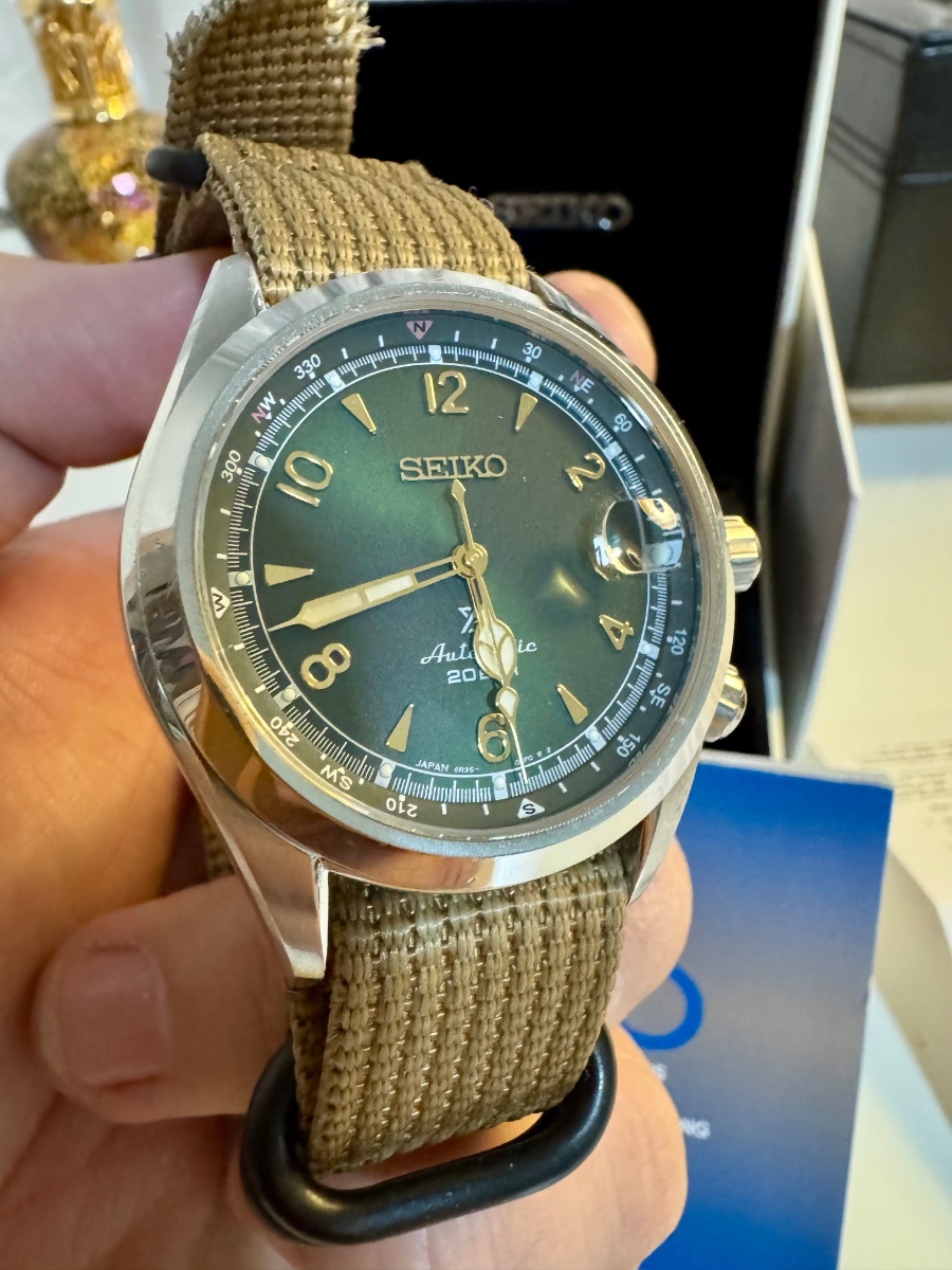 Můj plán je, že tohle jsou poslední hodinky a nyní už si jen budu užívat nasbírané hodinky. První dojmy: 1 hodinky jsou krásně malé! 2 indexy krásné září na světle (kovem nikoli lumi) 3 gotické ručky jsou rozkošné, připomínají murphy, které jsem prodal (kvůli velikosti), ale jsou decentnější a lépe viditelné 4 vnitřní luneta se krásně příjemně otáčí - nikde nic nevrklá ani neviklá 5 A/R není tak silný jako u sarxů, ale nevadí mi to 6 to je super, že maj výdrž 70 hodin 7 baví mě kyklop, datum je fakt dobře vidět 8 tyto fieldy velmi vzdáleně odkazují na fieldy od rolexu, ale není to žádná kopie, explorery byly možná na horách, ale tyhle byly v padesátejch taky na horách a já jsem to z nich navnímal! Budu je nosit do terénu místo protreků!, mám z toho radost! 9 konečně originální hodinky jedinečného seikostylu na ruce! A výborně padnou, nožky se krásně stáčejí dolů, obepínají zápěstí přiléhavě, celkový habitus je typicky seikovsky krásně oble-hranatý či hranato-oblý 10 číší z nich elegance a zároveň připomínají trošku něco z objevitelských cest julese vernea nebo tak něco... dobývání arktidy v 19. stol? Nechápu, jak se to seiku povedlo skloubit. Překvapivé a úžasné hodinky. Zatím tedy nadšení střídá nadšení, nadšení nezná mezí a moje sbírka mechanických hodinek je tak ukončena. Už nic dalšího nepotřebuju. sbírka mechanických hodinek v celku: porovnávačka velikostí: sednou jak ulité: kůže: popis z webu - helveti - (https://www.helveti.cz/seiko-alpinist-spb117j1) Hodinky Seiko Alpinist SPB117J1 z řady Prospex Land, fanoušky firmy Seiko dlouho očekávaný model, který konečně přináší modely "Alpinist", doposud dostupné jen pro japonský trh, také do Evropy. Disponují mechanickým strojkem, zaujmou neotřelým vzhledem. Ocelové pouzdro hodinek Seiko SPB117J1 je doplněno ocelovým náramek s možností mikroregulace na sponě. Černý číselník se stříbrnými indexy a ručkami je chráněn safírovým sklíčkem s vnitřním antireflexem, které je vysoce odolné proti poškrábání. Lepší čitelnost při zhoršených světelných podmínkách zajišťuje silná luminiscence na ručkách hodinek a bodech u indexů. Hodinky disponují ukazatelem data na pozici 3. hodiny, jež je díky lupě vždy snadno čitelné. Pro pobyt v přírodě je užitečná obousměrně otočná kompasová luneta, ovladatelná korunkou 4. hodiny. Srdcem hodinek je mechanický strojek s automatickým nátahem Seiko 6R35, s rezervou chodu 70 hodin. Hodinky potěší své majitele průhledným dýnkem, umožňujícím sledovat chod strojku s frekvencí 21 600 polokmitů za hodinu. Voděodolnost 200 m, je podpořena šroubovací korunkou a dýnkem. Hledáte-li alternativu k modelu Seiko SARB017, který není dostupný pro náš trh, jsou tu nové Alpinisty právě pro Vás. Označováno také jako: Seiko SBDC087