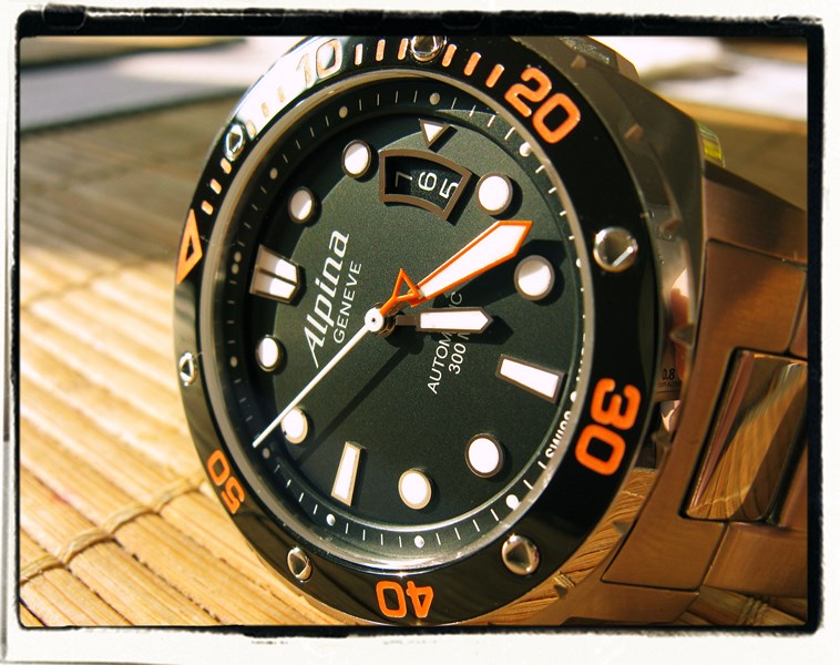 Alpina Extreme Diver Orange Nedá mi to a musím sem napsat trochu víc o těchto nevšedních hodinkách. Dostaly se ke mně vlastně úplnou náhodou, ve chvíli, kdy jsem prodal své předchozí LHC a pomalu plánoval, jak konečně našetřím na něco pořádného. Problém byl ale v tom, že inspirace stále nepřicházela. Procházel jsem denně prodejní vlákno, pročítal ostatní chronoweby, okukoval výlohy a nic? prostě nic. Na chvíli jsem se snad i vnitřně zaradoval, že jsem nadobro vyléčenej. Že je to pryč a že budu zase namísto pánských zápěstí prohlížet dámské dekolty a utrácet za "důležitější" věci (bože kolikrát už jsem si tohle vyslechnul). Už jsem se pomalu chystal, jak to doma oznámím a těšil se uznalé poplácávání po zádech a na to jak mi žena se slzami v očích řekne, jak je ráda, že jsem se konečně umoudřil, když se tu ukázaly tyhle potápky. A bylo hotovo... Rychlá schůzka, chvilka váhání a už jsem si domů odnášel krabici jak od vína. A to opravdu nepřeháním, protože tyhle hodinky se prodávají v boxu, který je vyvedený do tvaru potápěčské lahve a tomu odpovídá i vnější obal. A když se pak i doma stala věc naprosto nevídaná a manželka (a dokonce i děti) je okomentovala slovy "jééé, ty jsou hezký" (takový oranžový), rozplynul se i ten poslední mrak pochybností. Toliko na úvod a teď k samotným hodinkám. Je to pořádný kus železa a na ruce o nich prostě víte. S průměrem pouzdra 44mm jsou jasně těmi největšími budíky, které jsem kdy na ruce měl. Přesto se nosí opravdu skvěle a člověk se s nimi rychle sžije. Zpracováni je excelentní, lunetou s keramickou vložkou jde krásně otáčet a sedí přesně. Indexy na černém sendvičovém ciferníku jsou plastické a vystupují do úrovně vnitřního věnce s minutovou stupnicí. Na pozici 3 je datumovka zobrazující najednou tři dny. Nevím kdo a proč s tímhle "vylepšením" přišel, aktuální datum by myslím bohatě stačilo. Je to ale jediná výtka, kterou k nim mám a tenhle "triple date" jsem se časem naučil ignorovat. Korunka (nebo spíš koruna?) je šroubovací a má po obvodu gumovou úpravu pro lepší manipulaci ve vodě. Safírové sklo má vnější antireflex (kupodivu se ani moc nepatlá) a na dýnku mají průhled na strojek. Tím je kalibr AL525 vycházející z SW200-1 s 26 kameny, automatickým nátahem a uváděnou rezervou chodu 36 hodin. Ne testováni nebyl čas, nesundám je totiž z ruky. Přesnost chodu je v normě, momentálně dělají 7-10 vteřin do plusu. Na nějaké závěry je ale ještě moc brzy. Počkám, až si ještě trochu ?sednou?. Nebudu sem doslova přepisovat podrobnou specifikaci od výrobce, tu si dokážete dohledat sami. Přidám už jen pár fotek a konstatování, že mi dělají opravdu radost