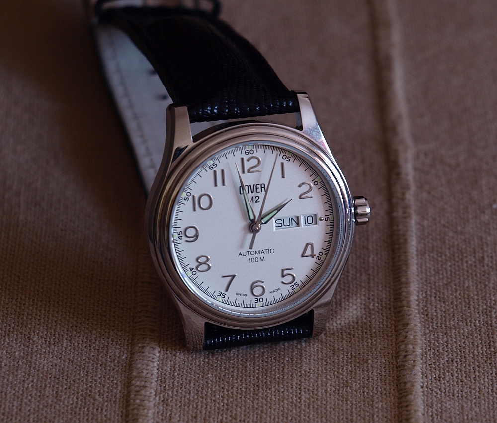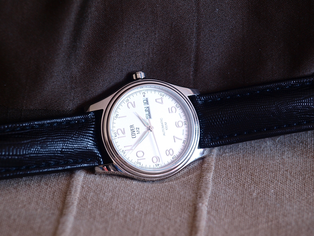 Po minulo tyzdnovej radosti http://forum.chronomag.cz/index.php?/topic/70652-zodiac-zo2316/&do=findComment&comment=1118996 mi dnes postar priniesol novy kusok s uplne opacneho stylu hodiniek. Hodinky svajciarskej firmy Cover, ktora bola zalozena v roku 1981 ako CHRONO AG a v roku 1999 bola prebrandovana na sucasny nazov Cover. VIac info o firme tu http://www.coverwatches.com/assets/Media/COVERMediaInformation.pdf Vybral som si model Cover M2.ST22LBK orientacna cena 400-500 eur. Jedna o malicky 38mm kusok, vyska 12mm, 45 je "lug to lug" rozmer. Vodotesnost do 100m. Sklicko je zafirove. Dynko je srubovacie a presklene. Stroj tikajuci vo vnutri je stara osvedcena ETA 2836-2 v "zltom" prevedeni, s vygravirovanym nazvom firmy na rotore. Puzdro je cele lestene, Zaujimavy je dvojity schod/okraj "lunety". Korunka ma idealne zvolenu velkost, samozrejme nie je srubovacia. Cifernik je krasny biely. Rucicky a plasticke hodinove arabske cislice su striebornej farby. Okienka dna a datum su na trejej hodine. Hodinova a minutova rucicka a indexy na jednotlivych hod.bodoch maju svetlo zelenu lumi. Hodinky su spracovane na velmi vysokej urovni, pohodlne sedia na ruke, celkovo ma milo prekvapili. Videl som viacero modelov od tejto firmy vo vylohach v hodinarstve a vzdy som si myslel, ze su len fashion sracky, coz vacsina quartz model aj bude, ale teraz uz viem, ze sa v ich ponuke da najst aj celkom podareny kusok, na svajciarske pomery za celkom zaujimavu cenu.