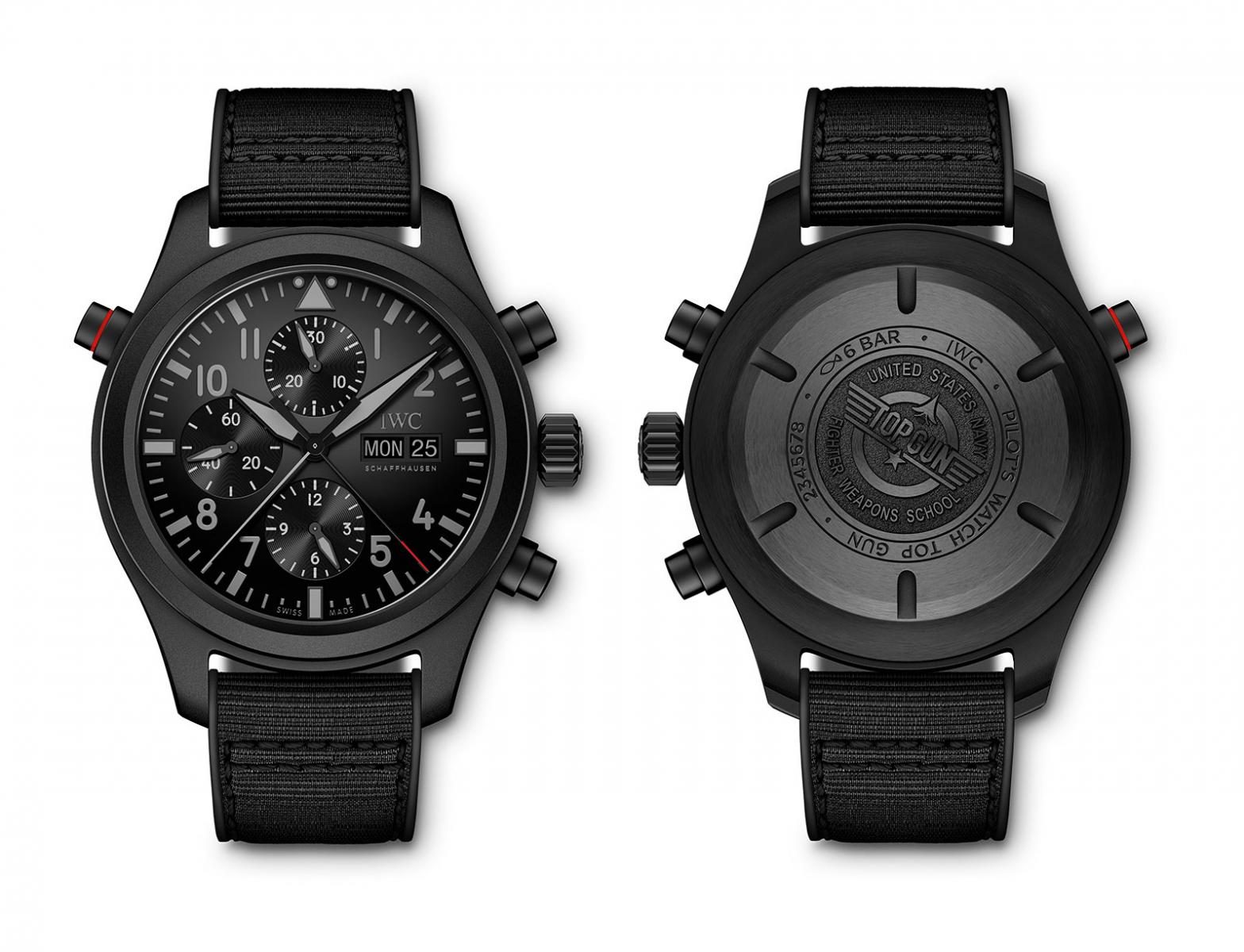 The Top Gun line will include the Pilot?s Watch Double Chronograph Top Gun Ceratanium (ref. IW371815). It?s a split-seconds chronograph that has a 44mm case made of a titanium-ceramic composite. The new material is light, hard and easy to form (made by 3D printing perhaps?), which is why it?s also used to make the chronograph pushers and pin buckle; in earlier generations of ceramic case watches those components were steel or titanium instead. The new Double Chronograph has an all-black colour scheme, with only the split-seconds hand and pusher having the slightest of red accents. Inside is the cal. 79230, which is a Valjoux 7750 plus IWC?s split-seconds mechanism.