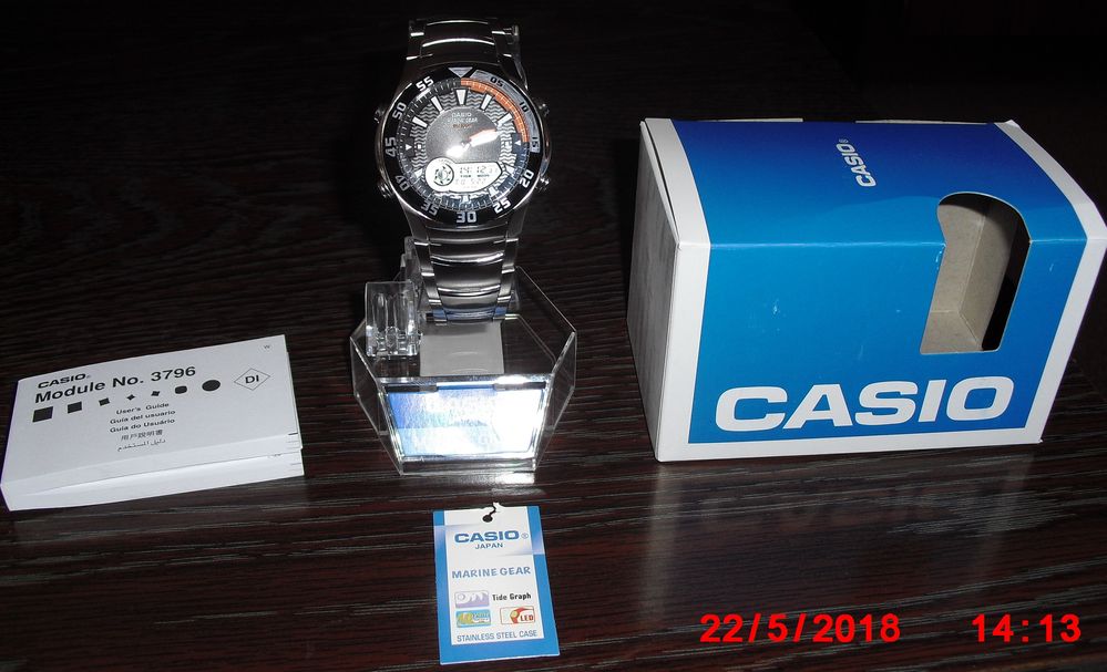 Včera objednány, dnes v 11 zvoní pošťačka. Zdroj Timestore, protože ani Fast, ani Koscom bohužel nemají... Seřízení otázkou chvilky, protože modul 3796 znám. Jinak, pro nezkušeného i s návodem dost komplikované. Hodinky jsou quartz, ana-digi, osazeny desetiletou baterií typu CR 2025, WR 10 bar, komplet v oceli, dílky tahu bohužel skládané. Plné by byly lepší, ale zase nelze chtít za pár korun zázraky. Sklíčko rovné, tvrzené minerální. Diametr 46 mm, nic pro párátka. Přehlednost parádní. Lumi v rámci Casio parádní, jinak v kontextu ostatních standard. Hmotnost s plným tahem až na ruku odhadem 24 cm - rovných 150 gramů. Standardní výbava: DT, ST až do 23:59:99, AL 1-3 vč. SNZ, TR 1 min - 24 hod, režim 12/24 hod a DST on/off. Navíc: Tidegraph (příliv-odliv) a Moonphase v závislosti na nastavení prvotního času/data. Dále již automaticky bez zásahu. Níže pár foto, kromě 1, půjčeného od Goldexu, aktuální moje. Díky za pozornost.
