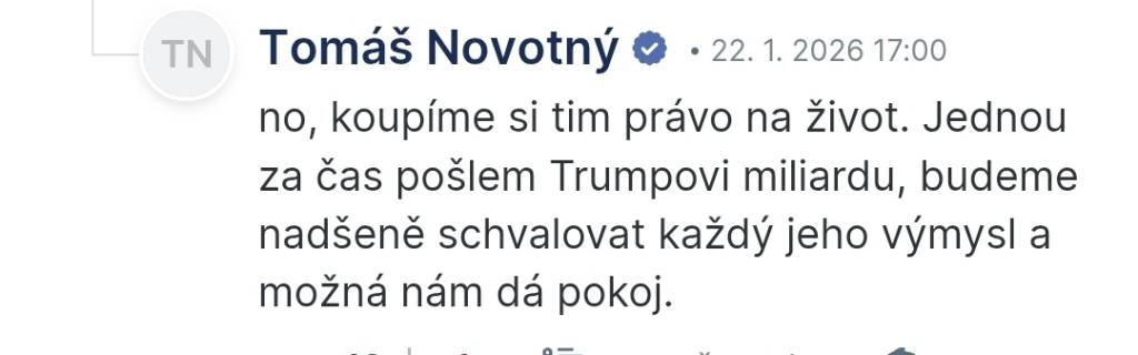 Dzos Odesláno 22. ledna Nahlásit Odesláno 22. ledna https://www.seznamzpravy.cz/clanek/domaci-politika-cesko-dostalo-pozvanku-do-trumpovy-rady-miru-297093 A teď jsem zvědavý, jak AB zareaguje. Obávám se, že to bude klasická vyčekávaná jako u "podpory" Grónska ... https://www.idnes.cz/zpravy/domaci/gronsko-je-nedilnou-soucasti-danska-rekl-babis-a-odmitl-pochvalna-slova-lavrova.A260122_101034_domaci_hejj 1