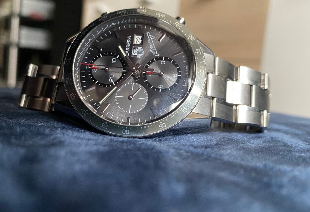 tommasini Odesláno 24. listopadu Nahlásit Odesláno 24. listopadu Ahoj, Za kamaráda, mlčícího člena tu mám na prodej moc pěknou limitku. Jedná se o chronografy se závodnickou DNA. Limitovaná edice byla vydaná k příležitosti výročí 50 let od posledního triumfu legendárního Juana Manuela Fangia ve formuli 1. Na ciferníku a proskleném dýnku je proto podpis závodníka. Limitovaná edice čítala 4000 ks. Ciferník má hezký sunburst a mění barvy od skoro černé po světlou šedou. Popis hodinek: Automatický chronograf Tag Heuer. Velikost pouzdra 41mm Strojek Calibre 16 Vodotěsnost 50 m Hodinky mám u sebe a co jsem zkoušel tak funguje. Rozběhnou se hned, chrono nuluje, datum překlápí. Kamarád mi taky říkal, že neobjevil nic, co by nefungovalo. Pouzdro nese známky používání, viz např škrábanec na boku na foto 3, ale zvýraznil jsem to záměrně. Na fotce 4 a 5 je hezky vidět, že v reálu je skoro neviditelný. Stejně tak luneta, která bývá často hodně odrbaná, nese u tohoto kousku pouze lehké oděrky. Celkově bych řekl, opravdu pěkný stav. K dispozici jsou hodinky na kovovém tahu a guma Tag Heuer se sponou Tag Heuer. Dále knížečka s návodem a nevyplněná garanční kartička. Takže vlastně pouze hodinky a dva náramky. Cena 48 000 Kč Možno zaslat nebo osobní odběr Praha 5 – Kladno.