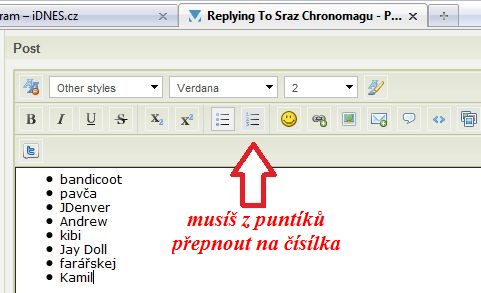 farářskej Odesláno 19. července 2010 Nahlásit Odesláno 19. července 2010 Vezmi poslední seznam, dej Ctrl C, zvol Přidat odpověď, tam Ctrl V, na konec dopiš sebe a odešli. Jo, to jsem udělal. Akorát mi to nezkopírovalo očíslovanej seznam a místo čísel tam byly hvězdičky. Já to fakt s počítačem moc neumím